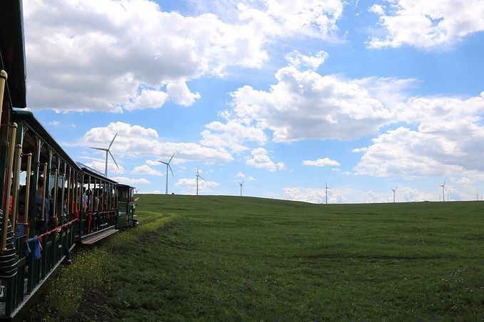 处处可见的风力发电塔,是人与自然和谐相处的最好见证。每年六月至九月间,辉腾锡勒草原鲜花盛放,被称为“世界上原生态的鲜花草原”。