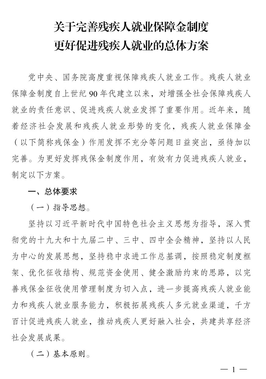 关于完善残疾人就业保障金制度 更好促进残疾人就业的总体方案