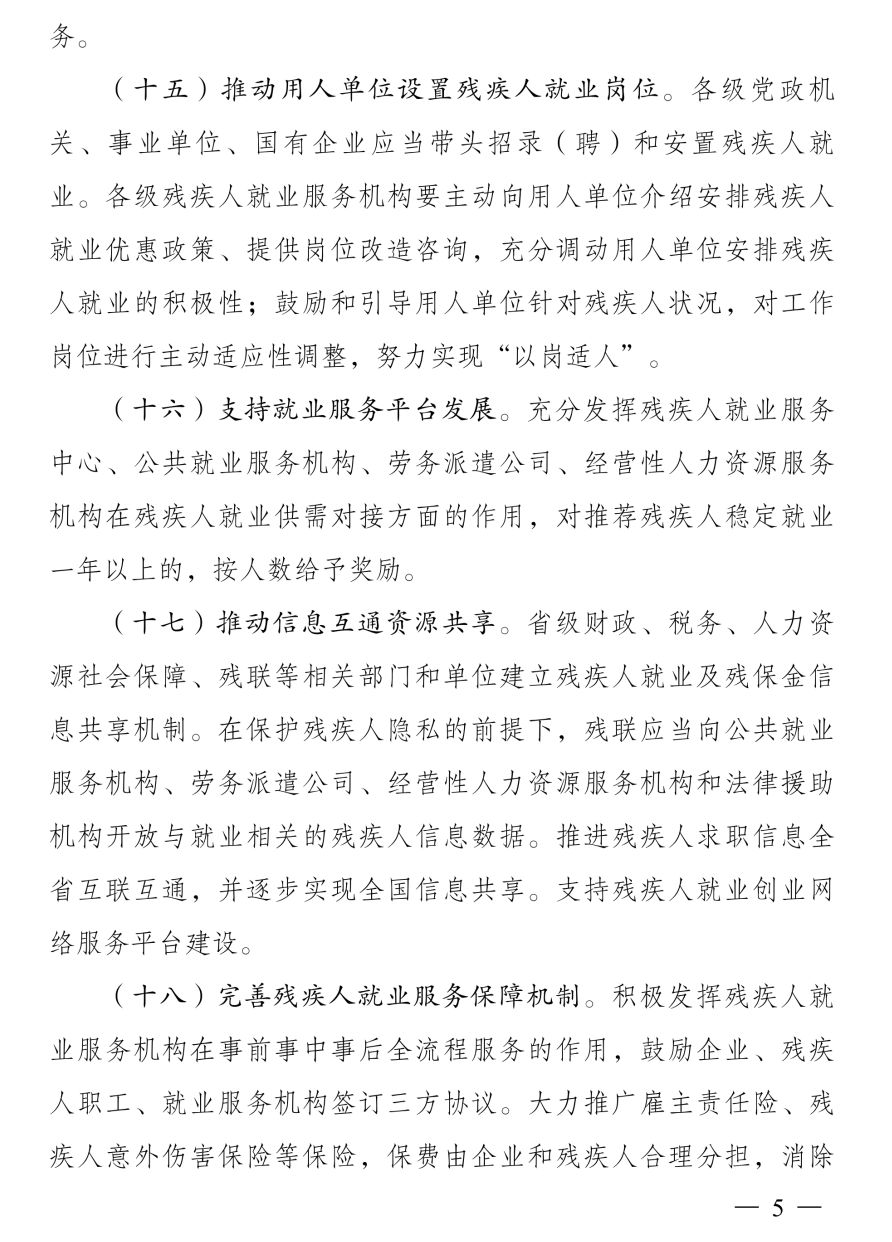 五是推动信息互通资源共享,省级相关部门和单位建立残疾人就业及残保金信息共享机制;在保护残疾人隐私的前提下,向有关机构开放与就业相关的残疾人信息数据;推进残疾人求职信息全省互联互通,并逐步实现全国信息共享。这将有利于解决数据互通难题,为相关部门和机构促进残疾人就业提供更全面、更有力的数据支撑。