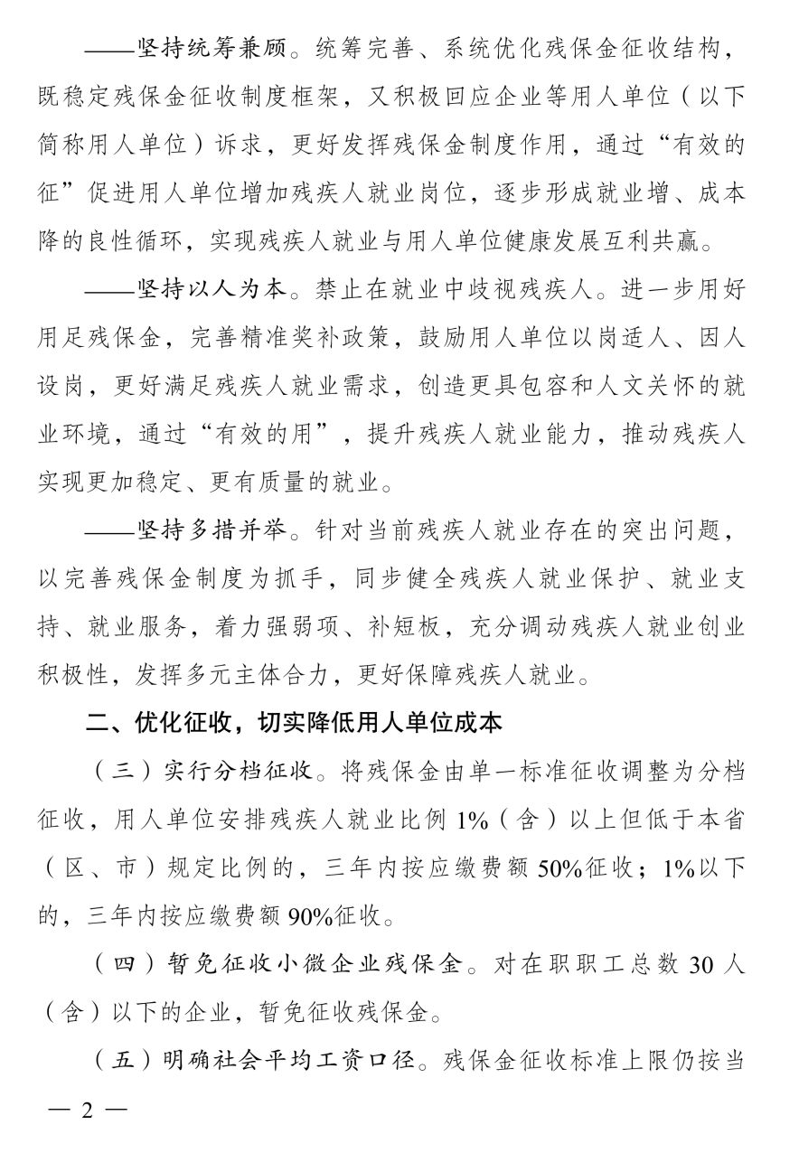 一是实行分档征收。将残保金由单一标准征收调整为分档征收,用人单位安排残疾人就业比例1%(含)以上但低于本省(区、市)规定比例的,三年内按应缴费额50%征收;1%以下的,三年内按应缴费额90%征收。