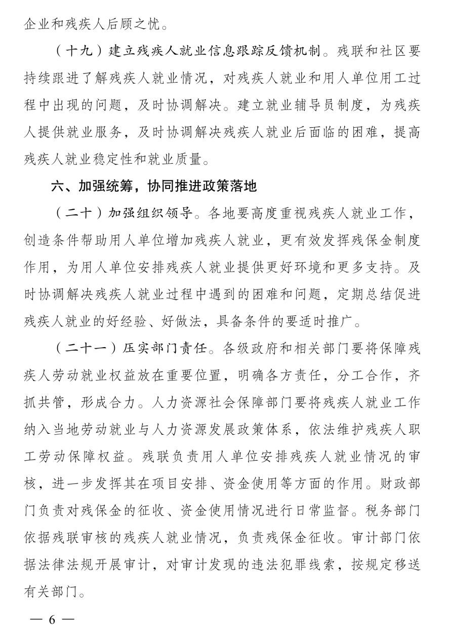 六是完善残疾人就业服务保障机制,鼓励用人单位、残疾人职工、就业服务机构签订三方协议,大力推广雇主责任险、残疾人意外伤害保险。这将为残疾人就业提供更好保障,有利于消除残疾人和用人单位的安全顾虑。