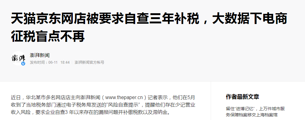 据澎湃新闻报道,多名网店店主在5月收到了当地税务部门通过电子税务局发送的“风险自查提示”,提醒自家店铺2017-2019年度电商平台收入对不上缴税款,要求企业自查3年以来存在的漏报问题并补缴税款以及滞纳金。
