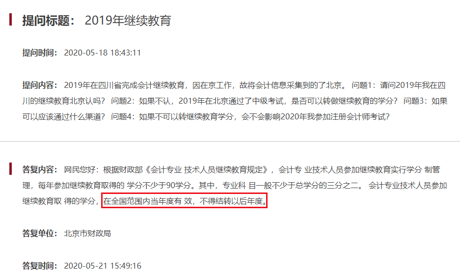 会计专业技术人员参加继续教育取得的学分,在全国范围内当年度有效,不得结转以后年度。