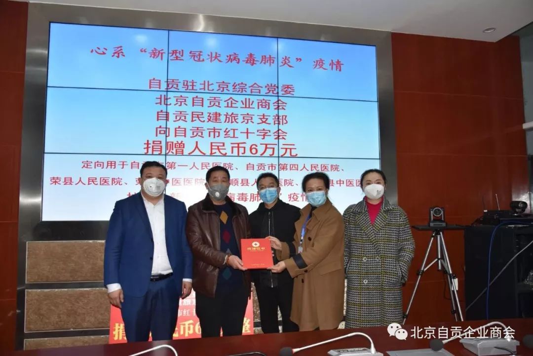 2月10日下午,在中共自贡市委统战部副部长、市工商联党组书记刘义,自贡市工商联副主席、总商会副会长郭建红的陪同下,秘书长张胜屏、监事长刘尧铭代表自贡驻北京综合党委、北京自贡企业商会企业家、自贡民建旅京支部、在京务工群众等向自贡红十字会捐赠共计60000元整 ,定向用于自贡市第一人民医院、自贡市第四人民医院、荣县人民医院、荣县中医医院、富顺县人民医院、富顺县中医医院抗击新型冠状病毒采购防疫物品专用。