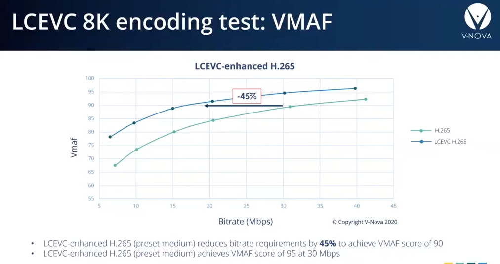 根据 LCEVC 的一些初步测试数据, 使用 LCEVC 增强的 HEVC 编码了一个 8K 文件, 同样的 90 分 VMAF, 经过增强的能节省 45% 的码率,并能在 30Mbps 的码率下获得 95 分,所以 LCEVC 还是能带来非常显著的带宽节省。