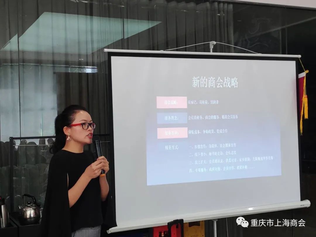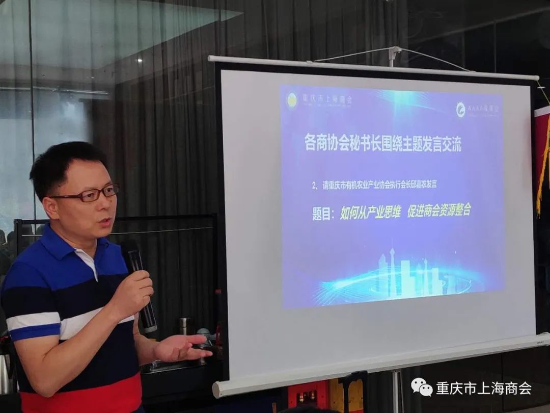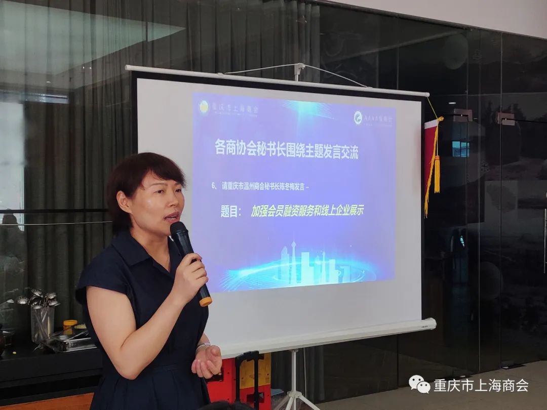 随后,6名商协会秘书长交流发言。重庆市四川商会秘书长熊静霞就“善用在线工具提高服务效能”进行主题分享,她说商会要以创新思维和超前眼光谋划发展,着力商会战略——双城记、高质量、领跑者,服务理念——会员的业务、商会的服务、精准的服务,服务方向——降低成本、争取政策、促成合作,服务方式——加强宣传、线下变小、线上扩大、专项服务,以此推进商会工作创新成长,模式转型升级。重庆市有机农业产业协会执行会长邱永川分析讲述了通过带动成渝两地有机农业产业发展,促进商会资源整合的案例故事。重庆市家居行业商会执行会长丁吉超从“双向认可的圈层观、共同认可的产品或服务、契合商业模式的价值整合、脚踏实地的经营管理协作”四方面交流分享了商会如何协助会员企业做好经济建设,他表示,会员间应相互交流、资源共享,让企业业务得到实质提升。重庆市海南商会秘书长符树权的发言题目是“每周坚持读书会和海南自由贸易港政策分享”,他重点突出了商会通过每周坚持开展读书会,在助力商会凝聚会员、开拓视野等方面的积极作用,并宣传介绍了国家赋予海南自由贸易港的各种利好政策。重庆市酒类流通商会秘书长郑孝平以“商会服务工作的流程再造与价值输出”为题,共同为商会继续拓展服务领域、优化服务水平,升华企业价值提出了良好建议。重庆市温州商会秘书长陈冬梅以“加强会员企业融资服务和线上企业展示”为题,温州商会在会内通过打造新生代联合会、太太俱乐部、羽毛球俱乐部等特色组织增强了商会的凝聚力和活力;其中有两点是值得其他城市思考的,其一、温州市政府重视、支持异地温州商会的发展,每年为温州商会在职秘书长授予荣誉;其二、温州农商行支持温州商人在异地固定资产的贷款,充分显现了温州资本的活跃和融资市场的开放度。