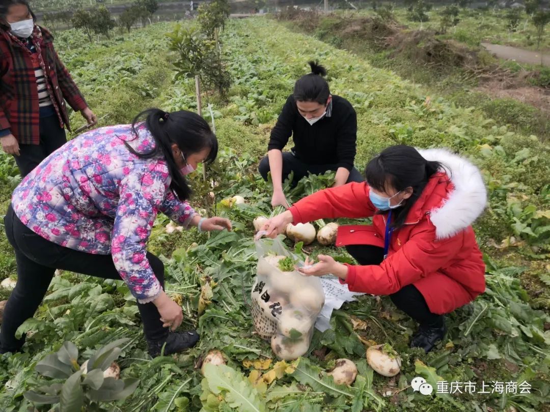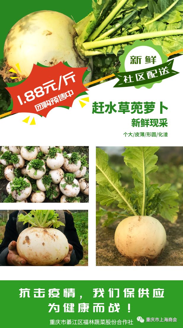 当前正处于新冠肺炎疫情防控的关键时刻,重庆市上海商会组织商会会员企业在严格做好疫情防控的同时,时刻不忘消费扶贫,助力打赢这场脱贫攻坚战。商会的定点扶贫村-綦江区东溪镇福林村的贫困户所种植的20多亩地约2万斤赶水草蔸萝卜,因新冠肺炎疫情导致萝卜滞销,贫困户心急如焚、一筹莫展。当下,这些农作物如果不及时销售,要么将会严重影响春耕春播,要么这么好的绿色环保食品就要废弃。重庆市上海商会想贫困户所想、急贫困户所急,在会长韦根的号召下,由重庆市上海商会妇女委员会牵头发起了“抗击疫情,保供应为健康而战”消费扶贫攻坚活动。妇委会主任伍沛臻、青委会主任陈国菊、重庆哲文会展服务有限公司总经理郑华,重庆合复知识产权代理有限公司总经理傅文强以及重庆市上海商会慈善基金理事会志愿者团队的同志们,在特殊时期采取特殊办法“以购代捐、以买代帮”,积极投入赶水草兜萝卜的义卖,在各自朋友圈、在居民小区、在复工企业单位义卖綦江东溪镇福林村的赶水草蔸萝卜。