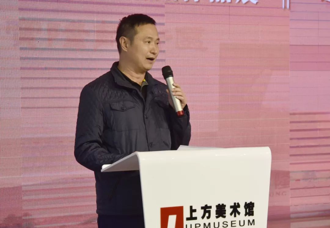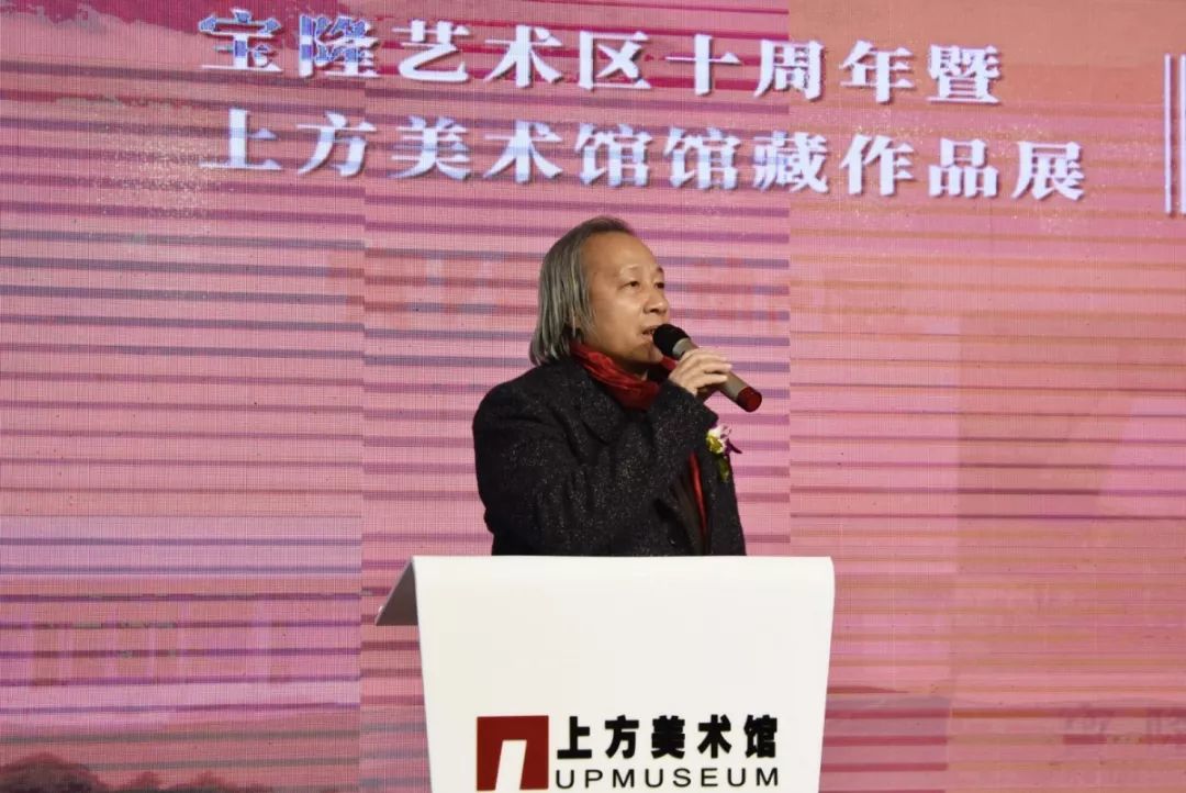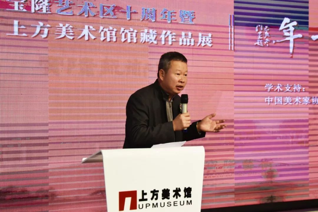 ▲宝隆艺术区董事长陈各新致辞答谢,感谢领导专家和艺术界同仁十年来的关心和帮助
