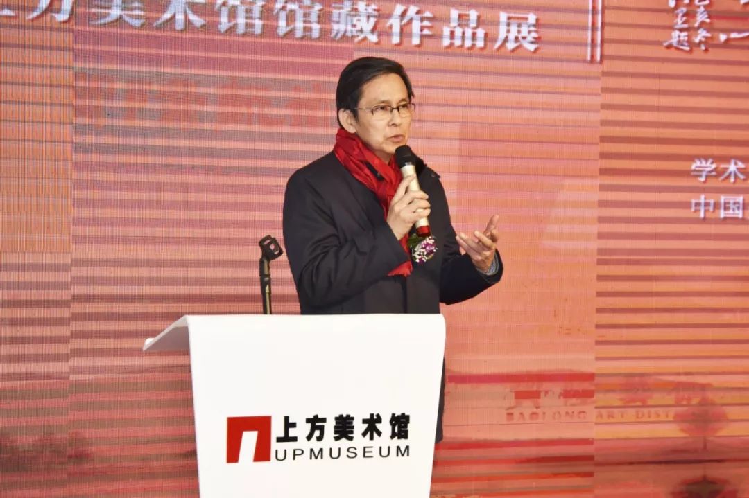 ▲ 中国美协副主席何家英开幕致辞,感谢宝隆艺术区董事长陈各新对工笔画研究院的无私支持