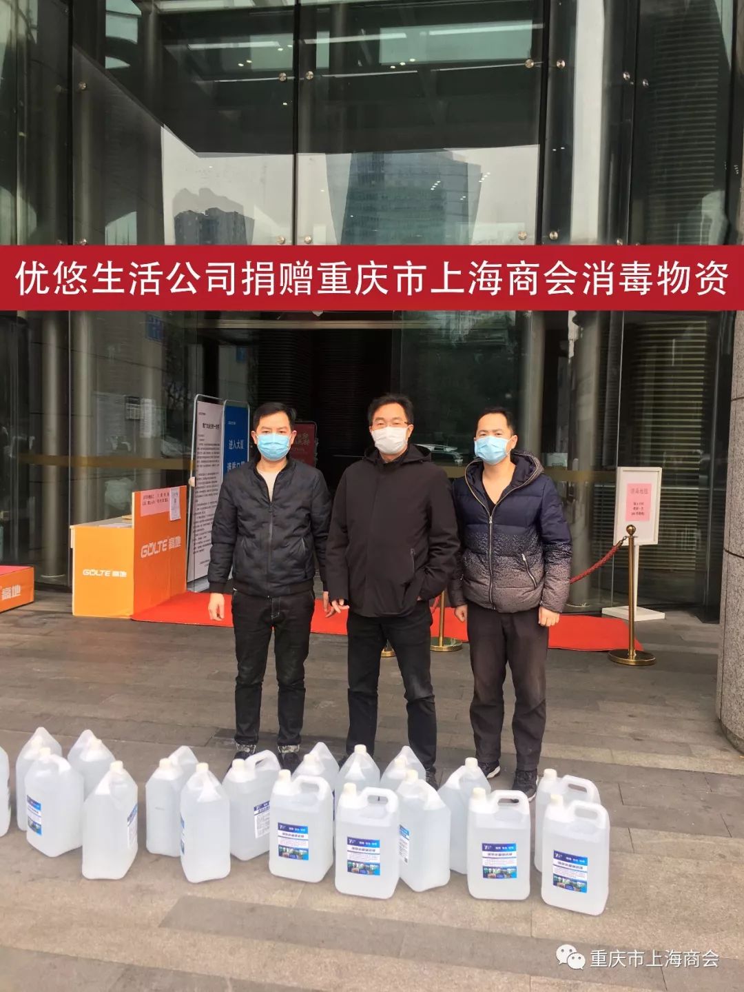 2020年2月13日,优悠生活公司向重庆市上海商会捐赠30桶消毒液,助力商会会员企业疫情防控工作的开展。重庆市上海商会执行会长彭广泽代表商会接受了捐赠30桶消毒液,并对优悠生活公司表示感谢。目前新冠肺炎疫情防控进入关键时期,企业面临复工复产物资相对缺乏的问题,优悠生活公司及时伸出援助之手,捐赠的消毒液对企业复工复产提供了极大的物资帮助。