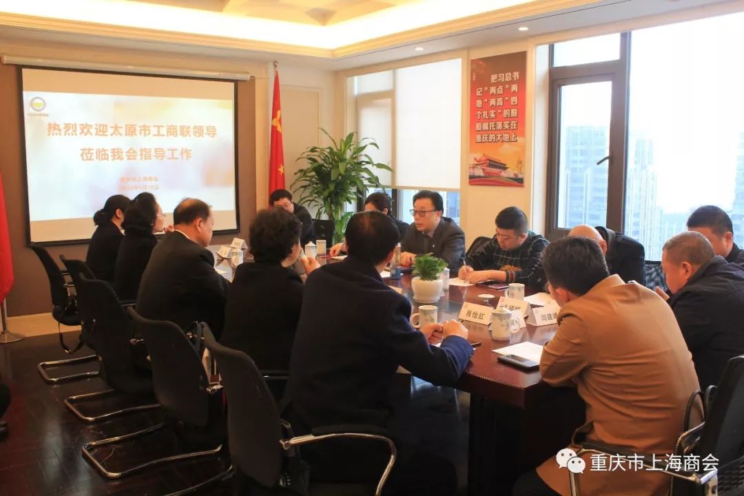 2020年1月10日下午,太原市委统战部副部长、市工商联党组书记许强,太原市工商联党组成员、副主席、行业党委书记白建红一行,在重庆市工商联社会组织综合党委专职副书记谢平、副处长孔莉陪同下莅临我会指导工作。我会党总支专职副书记、秘书长姚庆伟;副会长、妇女委员会主任伍沛臻;副会长沈时清等参加座谈交流。