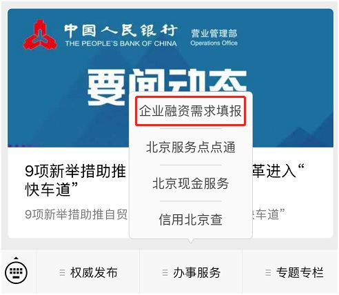 三、关注“中国人民银行营业管理部”微信公众号,点击“办事服务”->“企业融资需求填报”即可在线填报;
