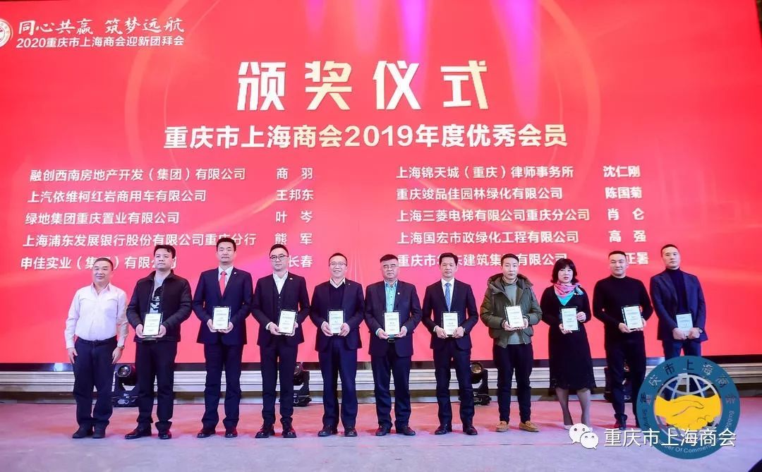 随后进行了颁奖仪式,重庆市上海商会名誉会长詹绍俊为我会新会员及升格会员授牌;市民政局社会组织管理局副局长、一级调研员龚建国,市工商联专职副书记谢平、会员部副部长马妮妮分别为我会21名“2019年度优秀会员”颁奖;市政协人资环建委主任蒋又一,市工商联党组成员、副主席、社会组织综合党委书记陈智分别为我会20名会员企业家颁发了“2019年纳税超千万元贡献奖”奖牌。