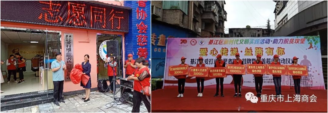 随后,重庆市上海商会会长韦根与重庆市东阳商会会长韦秀萍共同为“爱打通志愿者协会慈善超市”铭牌揭牌。