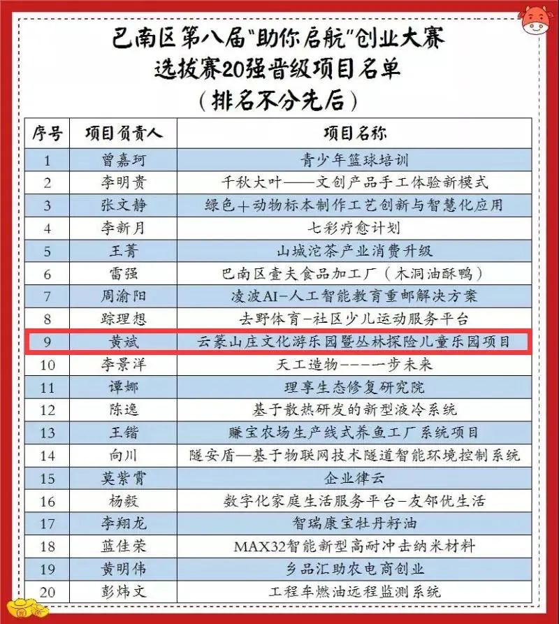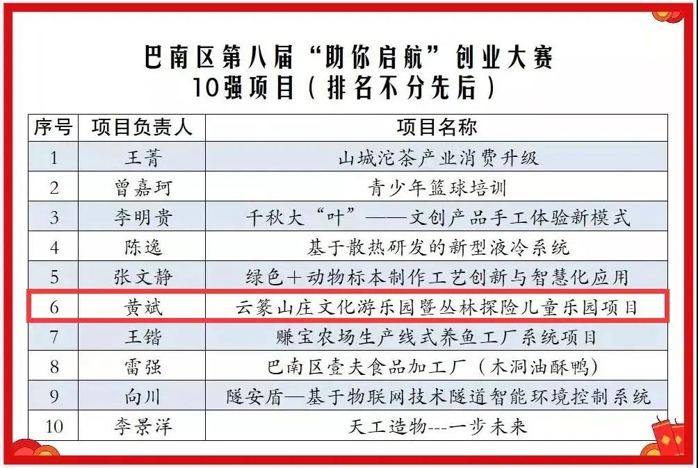 决赛于12月3日在重庆市巴南文化艺术中心 9 楼星光剧场上演,10 强项目通过放飞梦想、决胜战场、终极 PK 三个环节依次评比,云篆山丛林探险顺利通过前两轮放飞梦想、决胜战场的评比,并荣获本次创业大赛优胜奖!