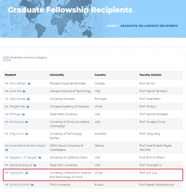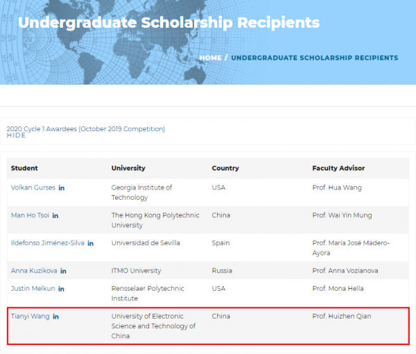 IEEE MTT-Society Undergraduate Scholarship Award为IEEE国际微波理论与技术学会(MTT-Society)授予硕士生/本科生的最高荣誉,至今已有20年历史,用于资助和表彰在射频、微波、毫米波等领域中展现出突出综合素质的本科/硕士生。本年度现有来自全球的6位学生获得该奖,即欧美4人(含美国乔治亚理工学院等)、香港理工大学1人、以及电子科技大学1人。
