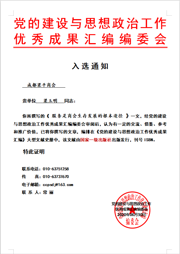 四川省重庆商会云平台讯 日前,从成都梁平商会获悉,商会梁玉明秘书长撰写的理论文章《服务是商会生存发展的根本途径》一文,被正式纳入由中共中央党校出版社公开出版发行的大型文献史册——《党的建设与思想政治工作优秀成果汇编》中。