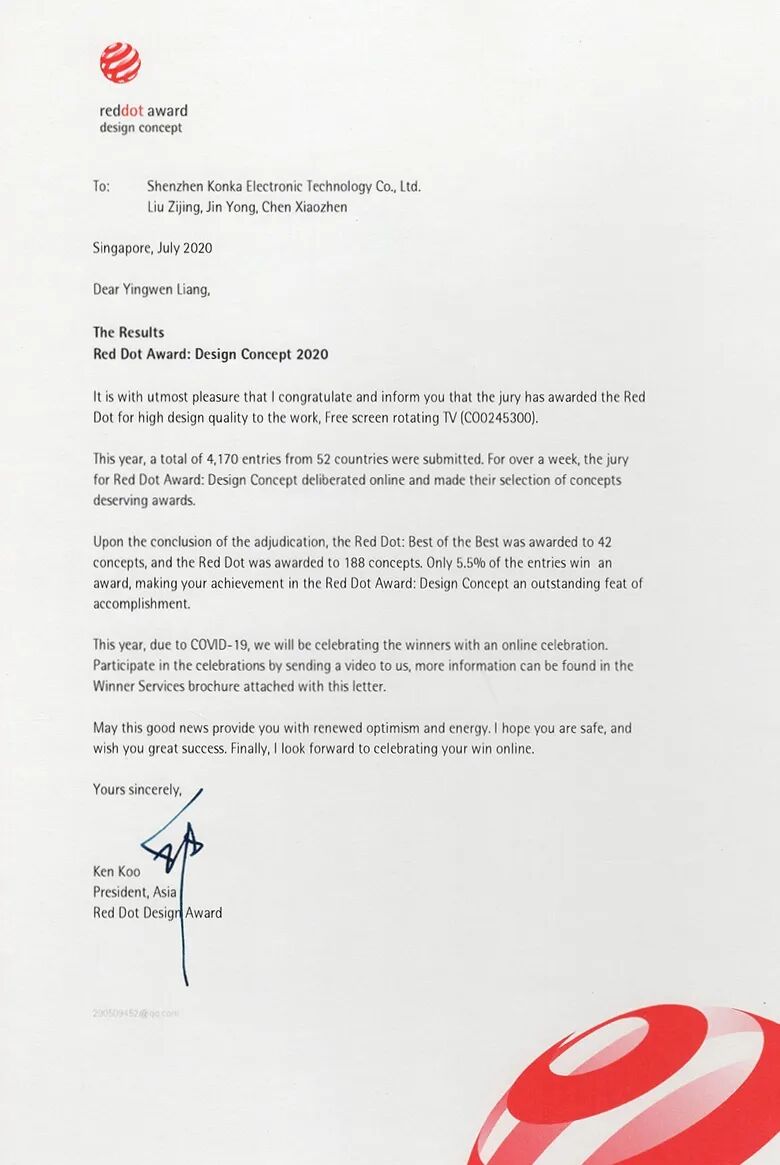7月1日,康佳“Free screen rotating TV”从全球52个国家的4170余件作品中脱颖而出,夺得“红点概念设计奖”,成为230个获奖作品之一,该奖项的获奖概率仅为5%。
