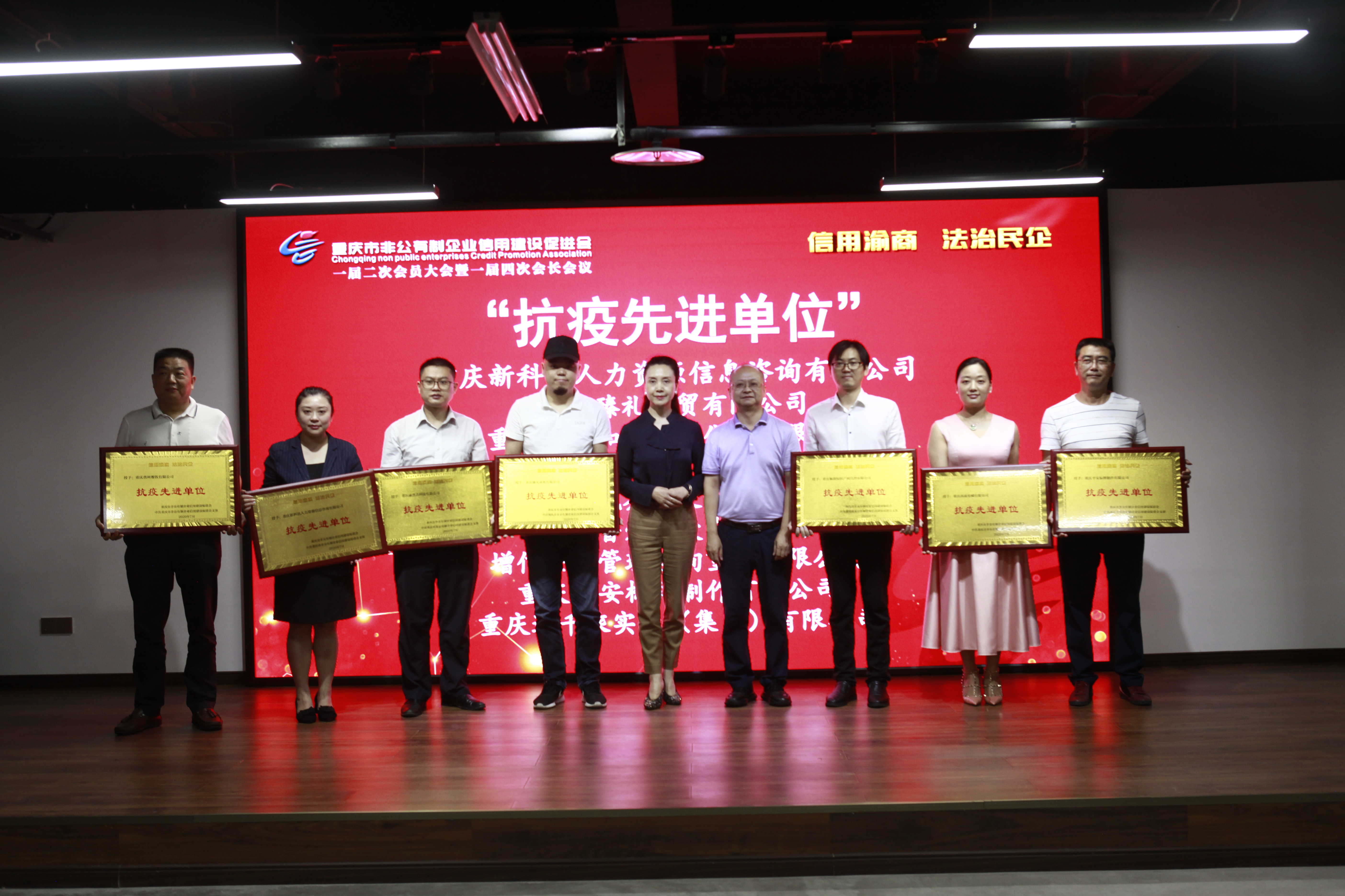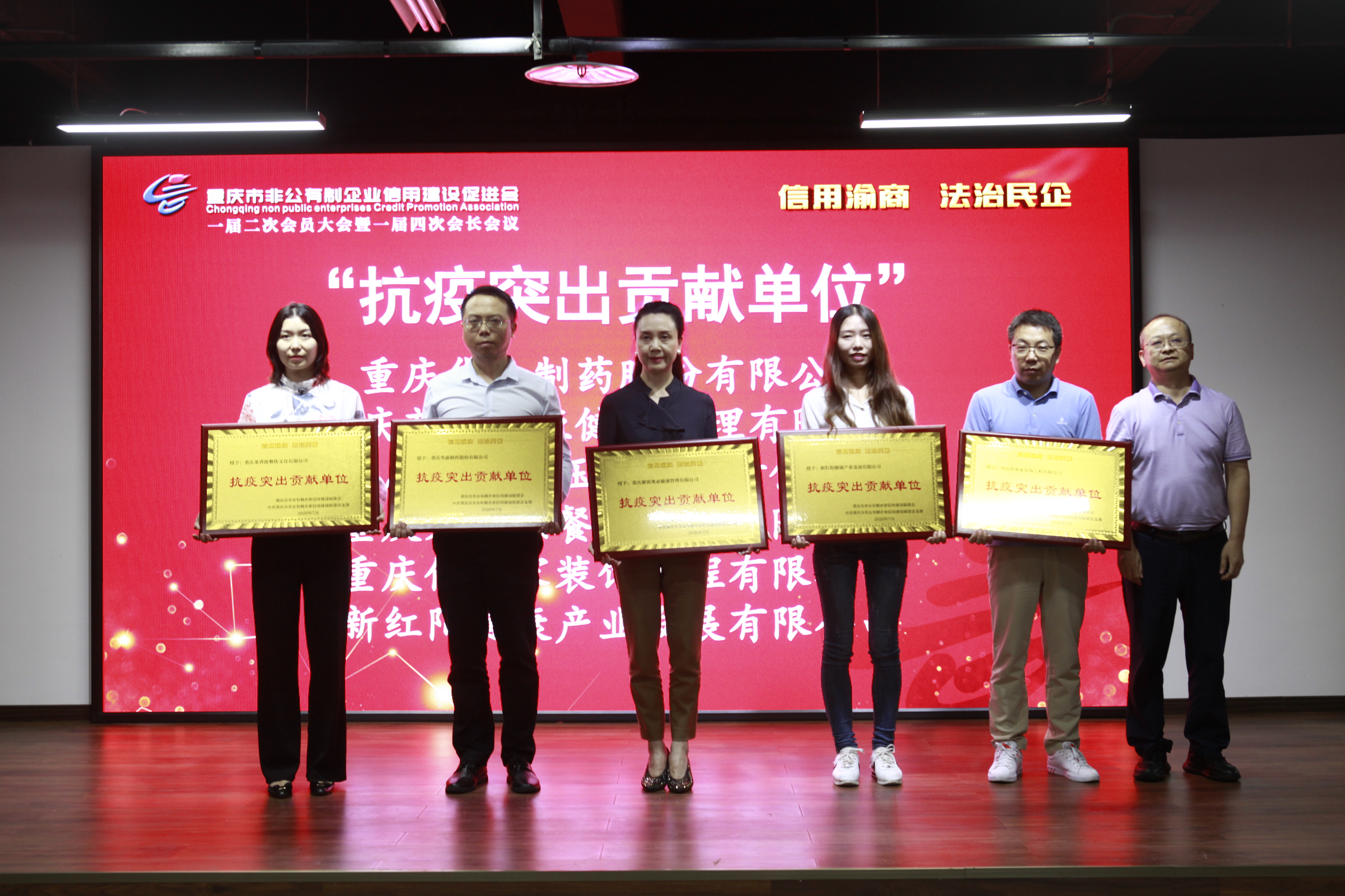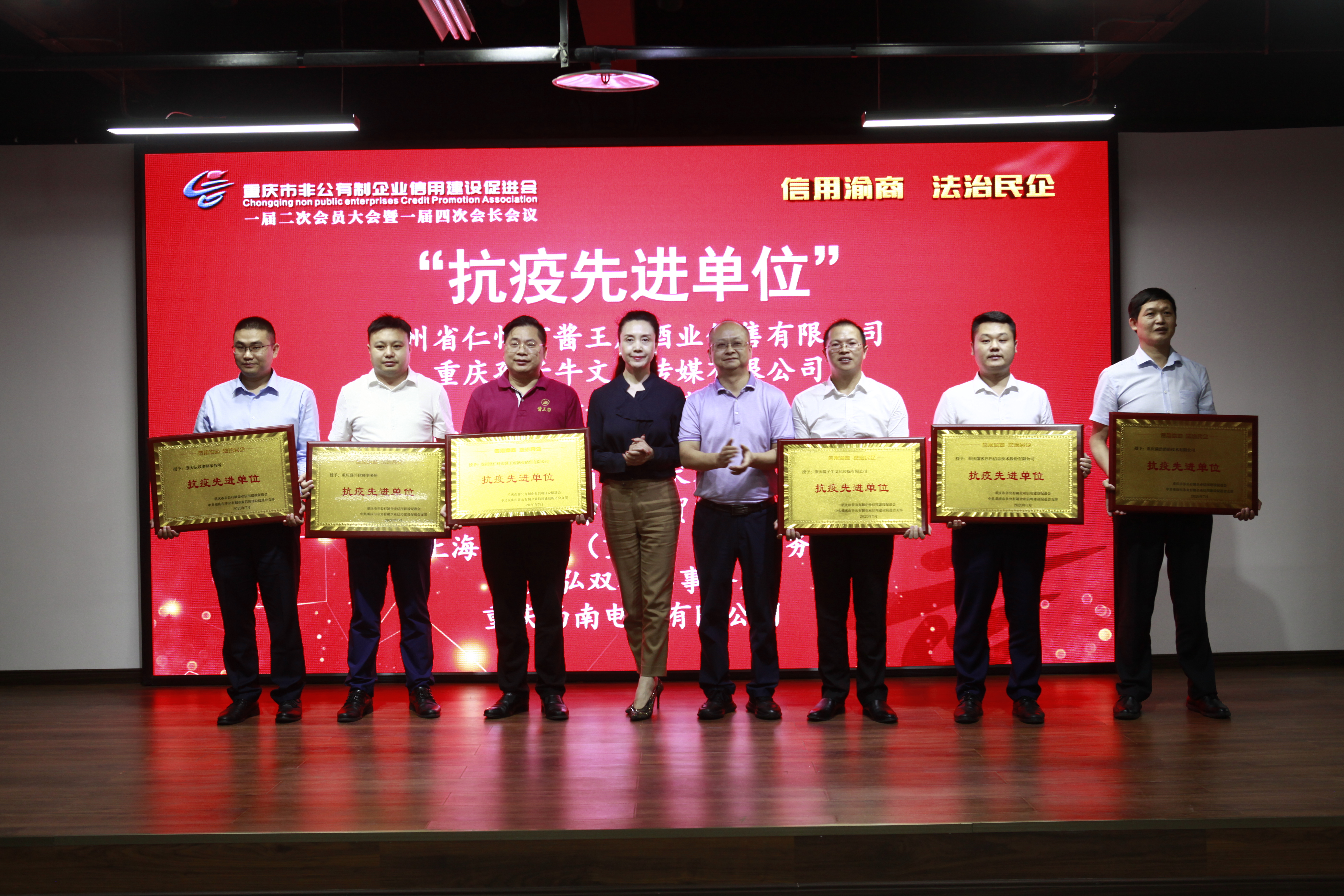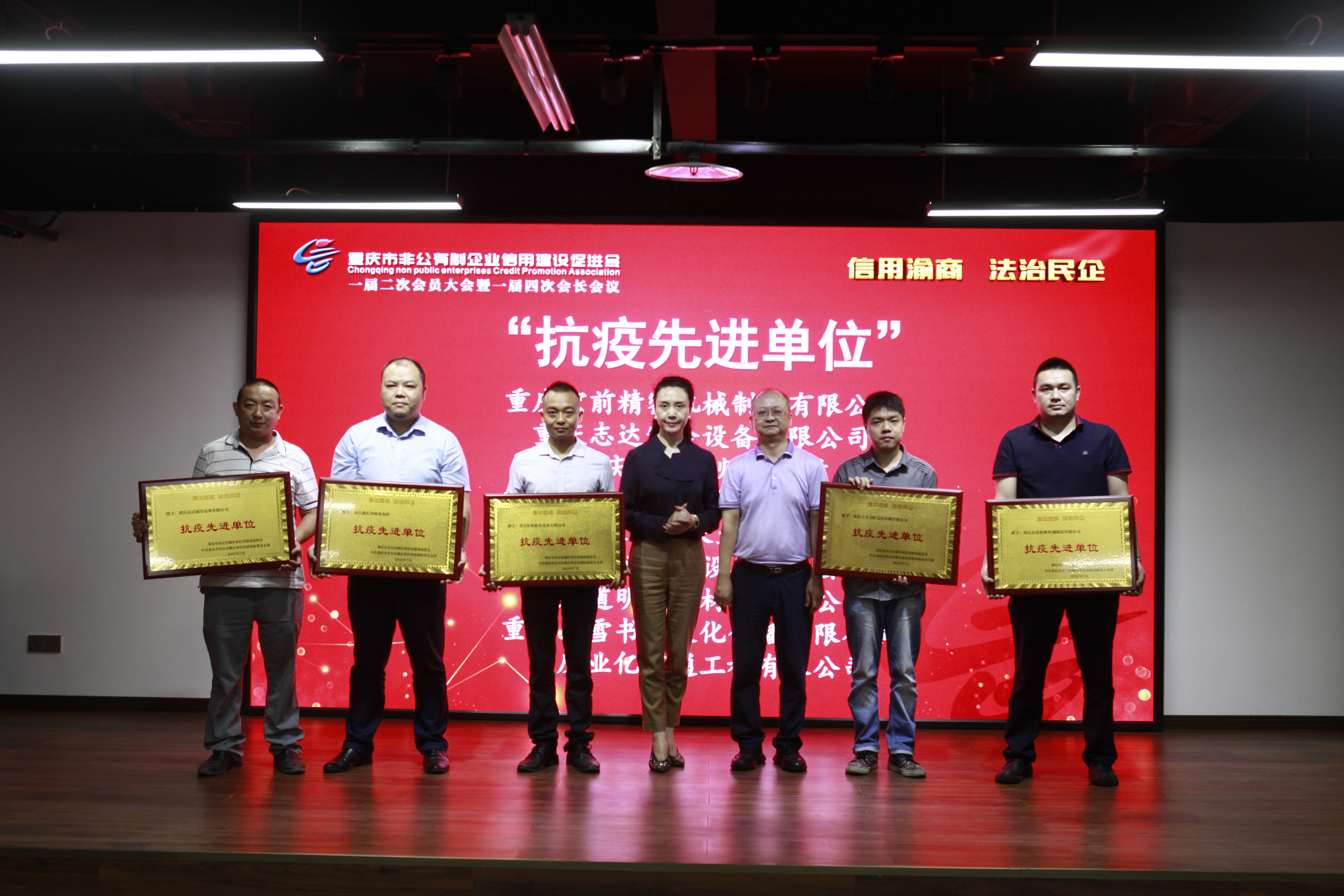 市工商联副主席王进和信促会执行会长彭学平向宏前精密、志达制冷、渝宏律所、恒悦机电、立雪书院等单位颁发“抗疫先进单位”牌匾