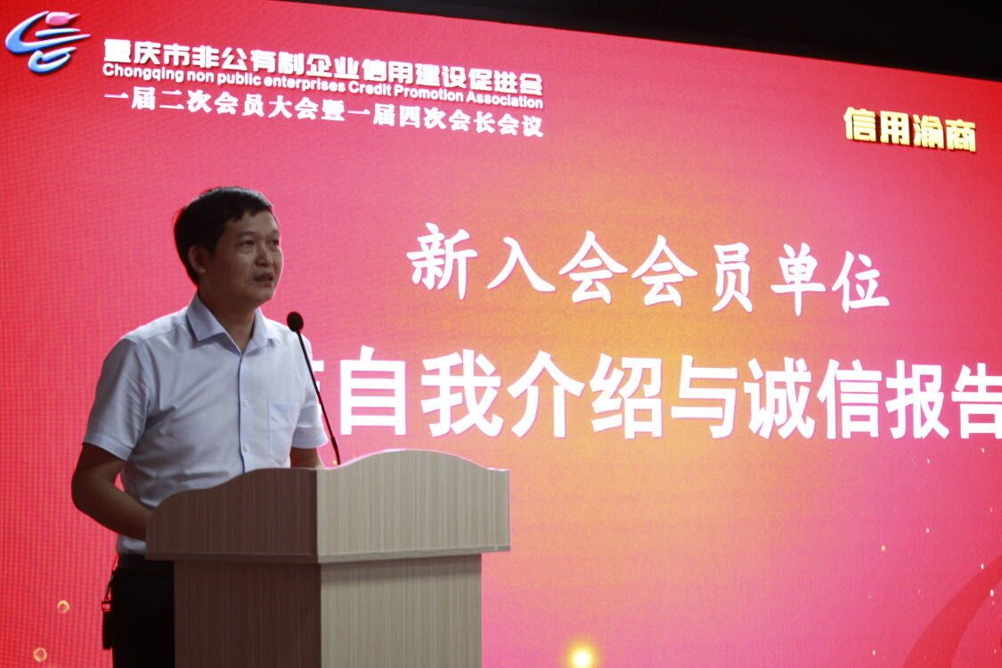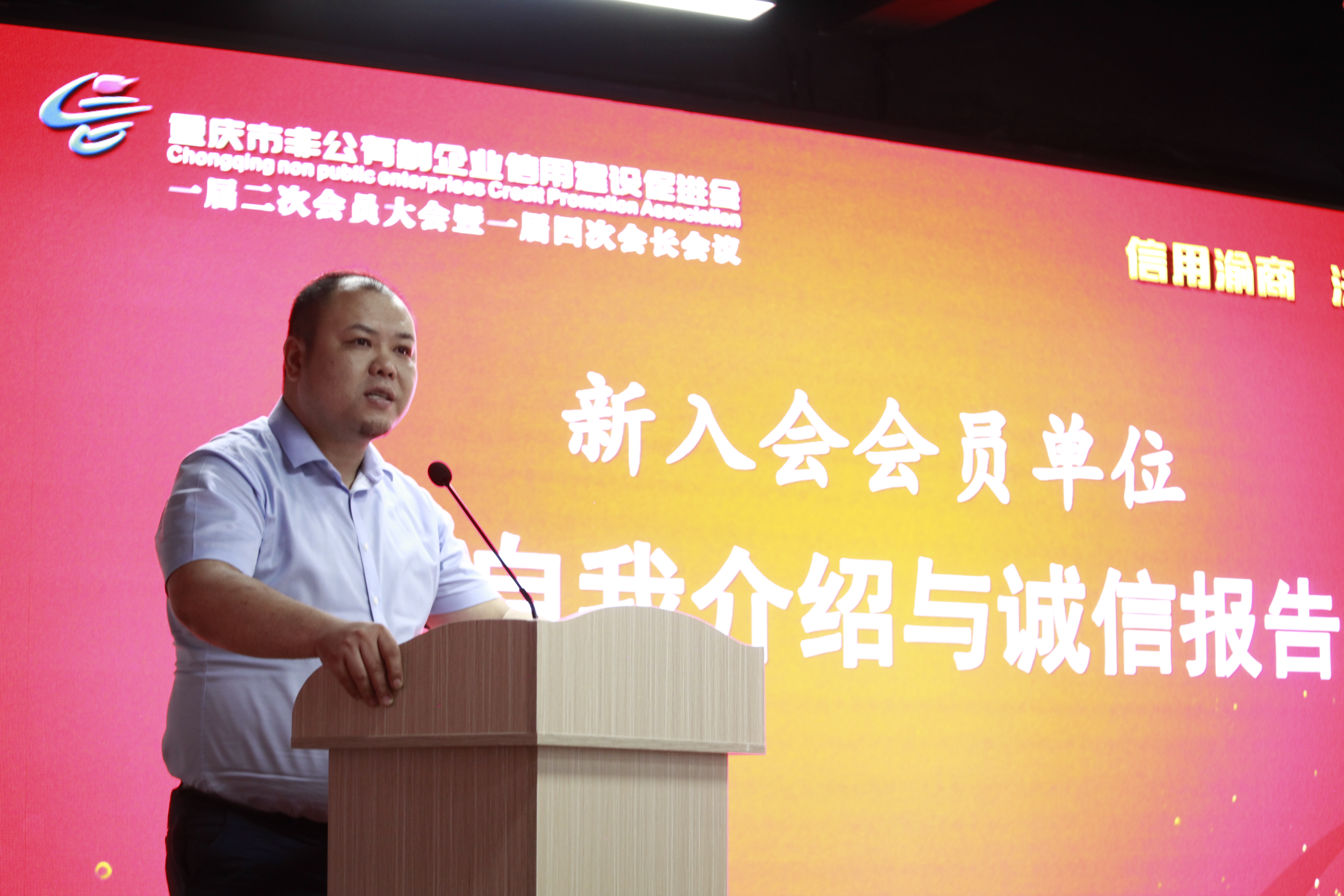 在拟入会单位接受会员大会审核环节,拟任副会长重庆满浩消防技术有限公司董事长曾祥辉、重庆弘双律师事务所主任牟均发、深圳多度科技有限公司西南分公司总经理蒋克宁、重庆西南电梯有限公司董事长高菲,拟任理事重庆康普达科技有限公司董事长袁正刚,拟任会员重庆渝宏律师事务所主任谢旭、重庆新科讯人力资源信息咨询有限公司董事长章岚、重庆万盾企业信用管理有限公司总经理王微波、重庆臻礼商贸有限公司董事长张艺、重庆立雪书院文化传播有限公司董事长游刃、重庆恒悦机电设备有限公司董事长黄林依次作自我介绍与诚信报告,签署“信用渝商、法治民企”践行承诺书,并在通过审核后接受颁牌。