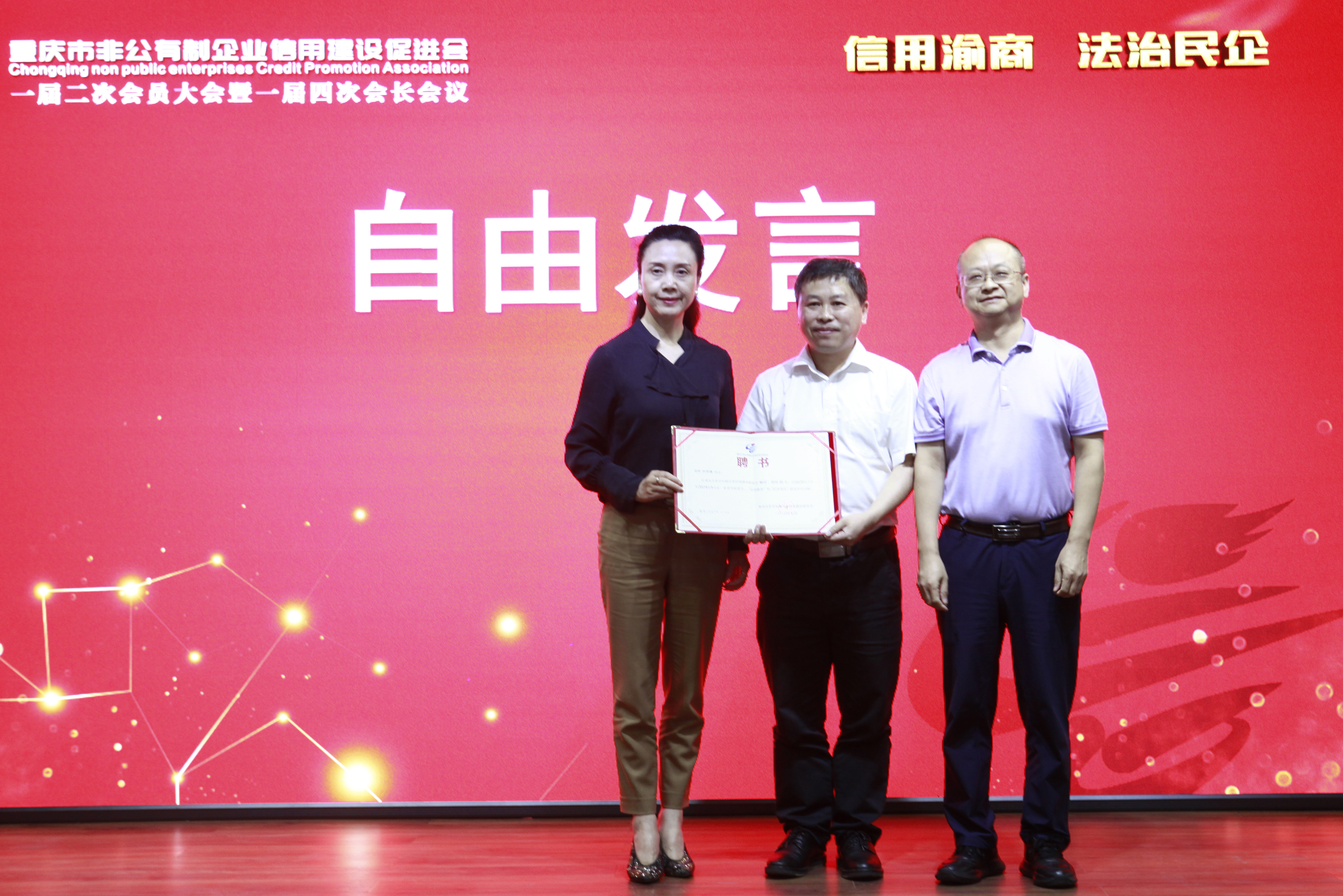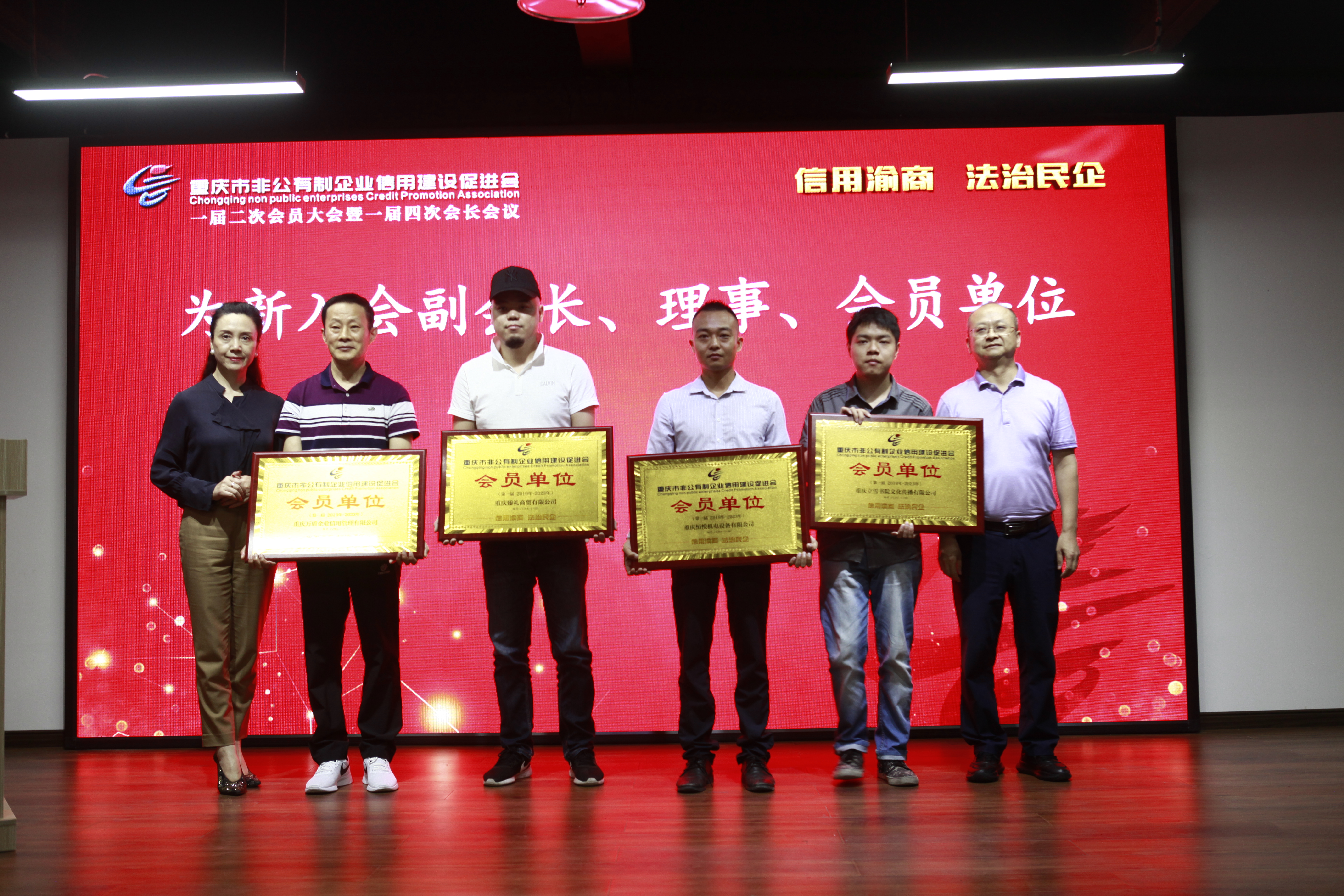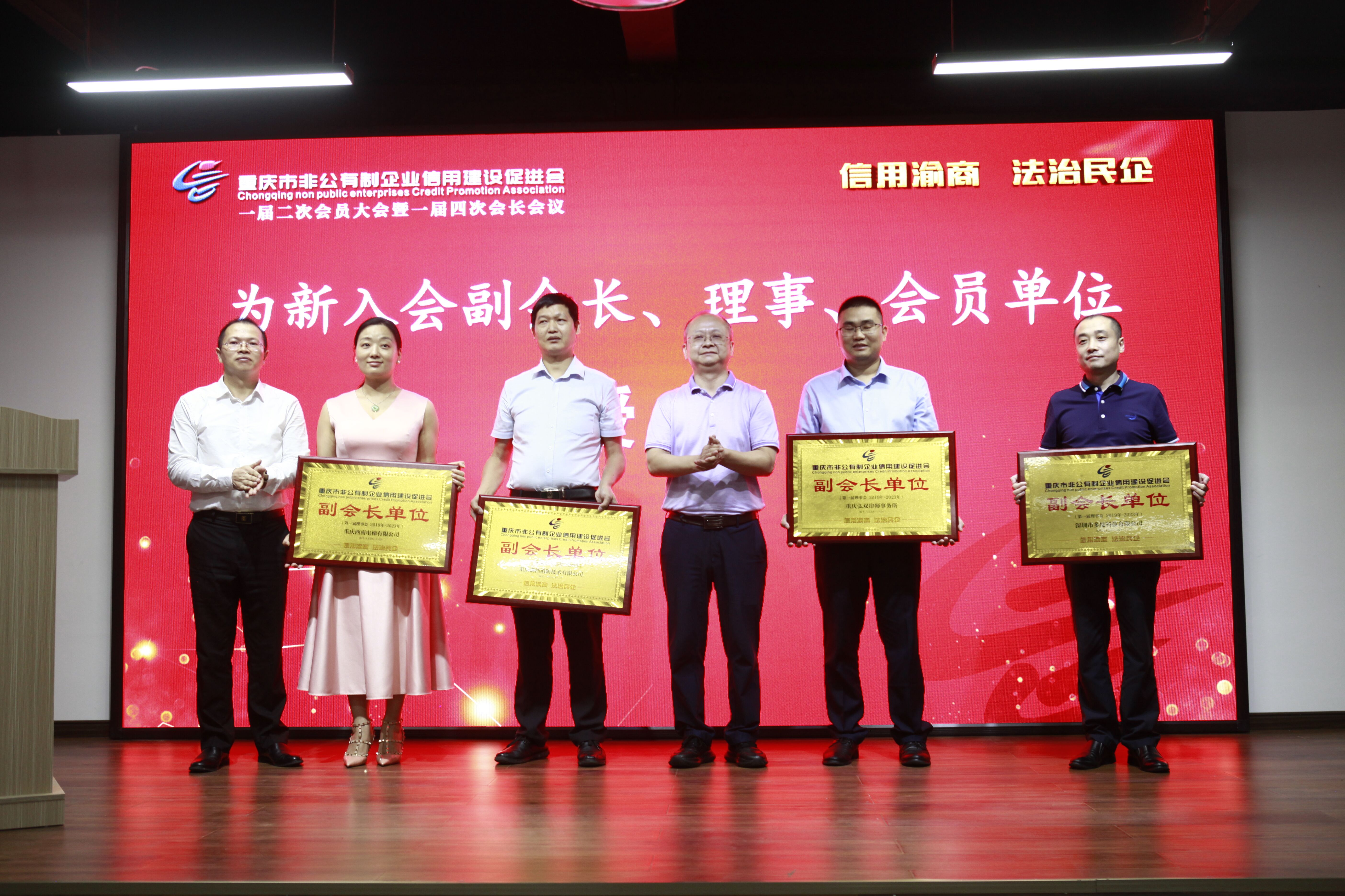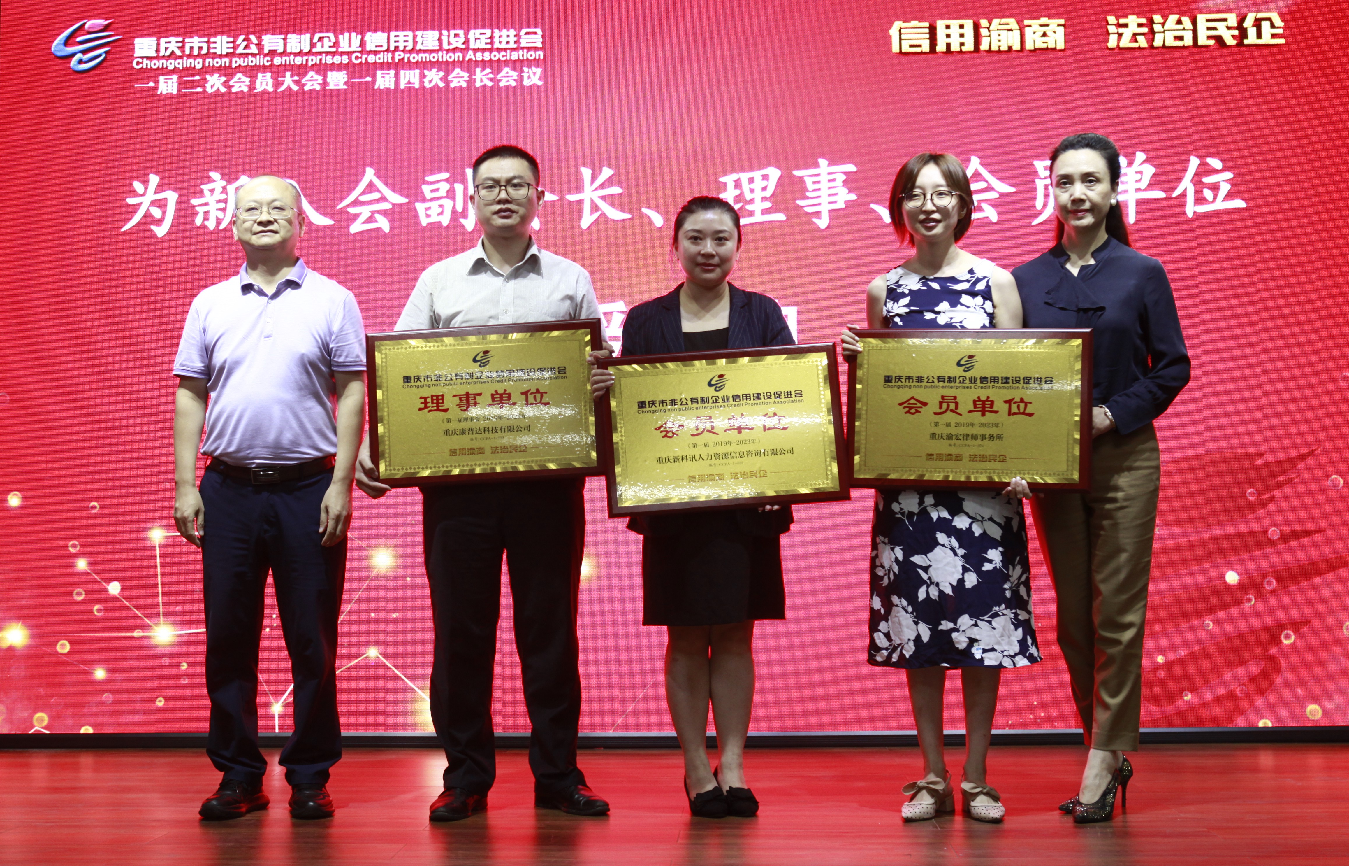 市工商联副主席王进和信促会执行会长彭学平为康普达科技公司新任理事单位和渝宏律所、新科讯人资等新会员单位颁牌
