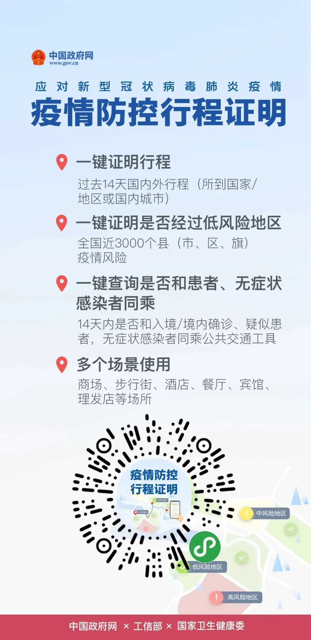 无症状感染者给疫情防控工作带来一定压力,为帮助防疫人员迅速筛查出密切接触者、精准查验人员旅行史,早一步开展主动检测定位无症状感染者,实现“早发现、早隔离、早报告、早治疗”,国务院客户端小程序上线“疫情防控行程证明”,包含三项功能: