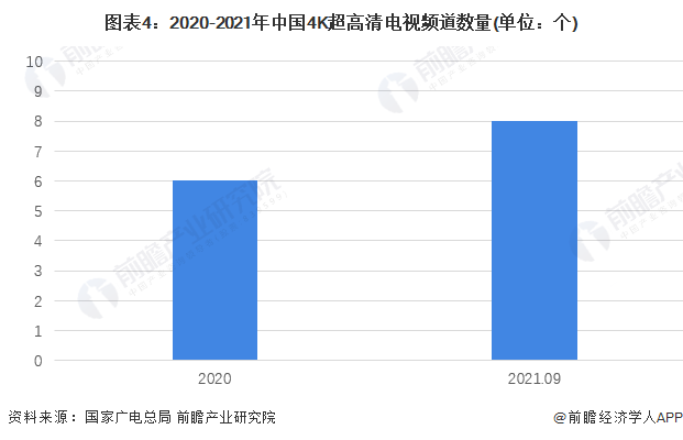 从高清电视频道数量看,截至2021年9月,已经开通的4K超高清电视频道达到8个,较2020年底增加2个。在超高清技术逐渐替代传统技术的趋势下,超高清频道数量将持续增加。