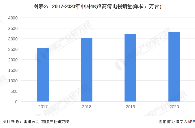 目前,超高清视频的主要技术包括4K和8K,4K技术经过多年发展已经趋于成熟,且随着4K电视进入寻常百姓家。根据奥维云网数据,2017-2020年中国4K超高清电视销售量不断上升,2020年达到3338万台,较2019年增长了3.3%。
