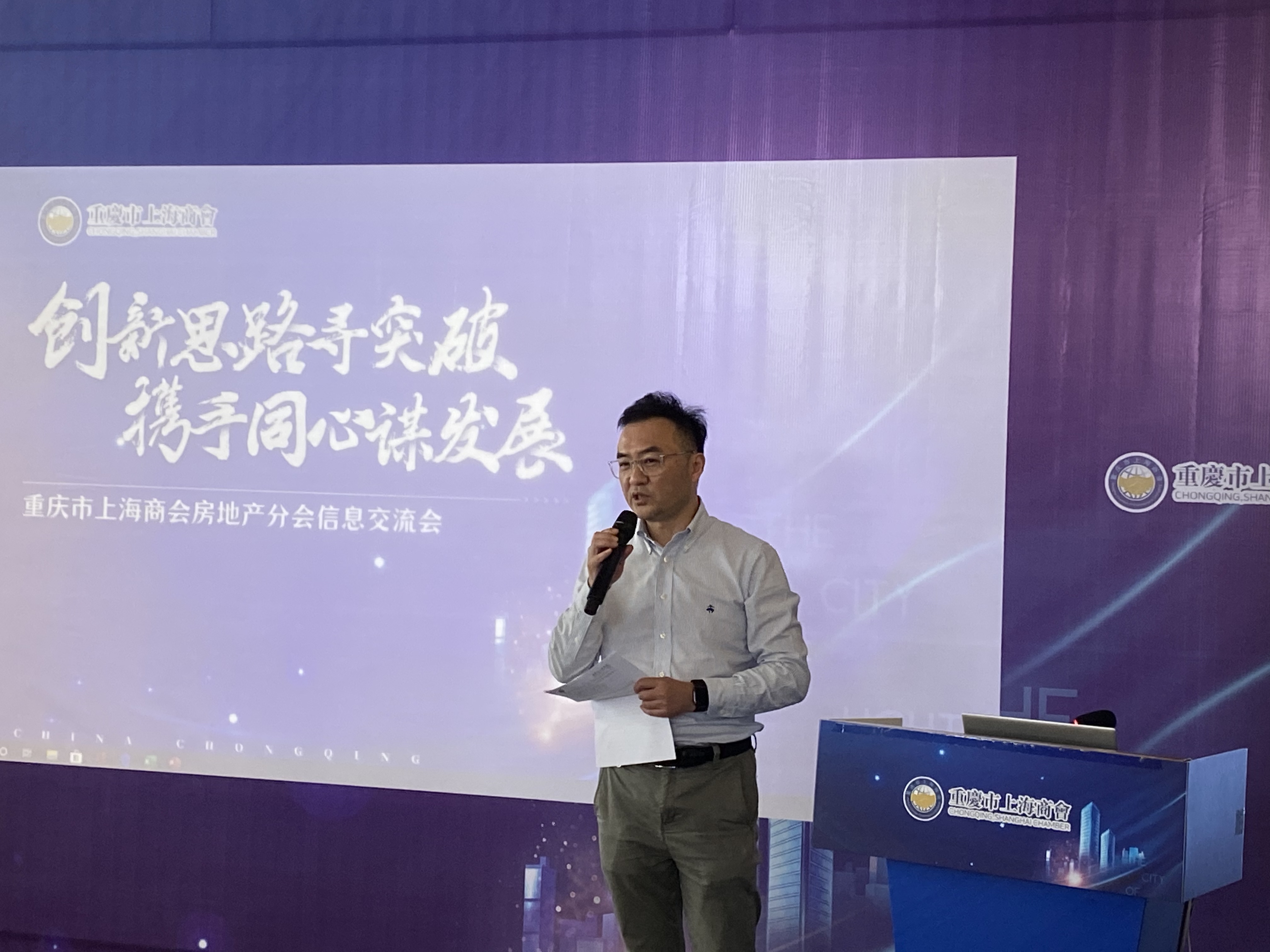 7月24日下午,以“创新思路寻突破 携手同心谋发展”为主题的重庆市上海商会房地产分会信息交流会在绿地▪听江左岸艺术中心顺利召开。重庆市上海商会会长韦根,执行会长彭广泽,常务副会长、房地产分会会长叶岑,常务副会长、综合服务分会会长沈仁刚,秘书长姚庆伟等40余人参加了此次交流会。会议由绿地集团重庆置业有限公司副总经理、房地产分会会长叶岑主持。