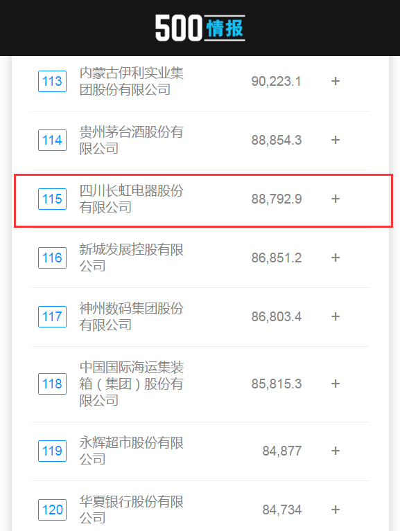 7月27日,2020年《财富》中国500强排行榜发布,该榜单考量了全球范围内最大的中国上市企业在过去一年的业绩和成就。其中,四川长虹以887.93亿元营收位列《财富》中国500强榜单第115位。
