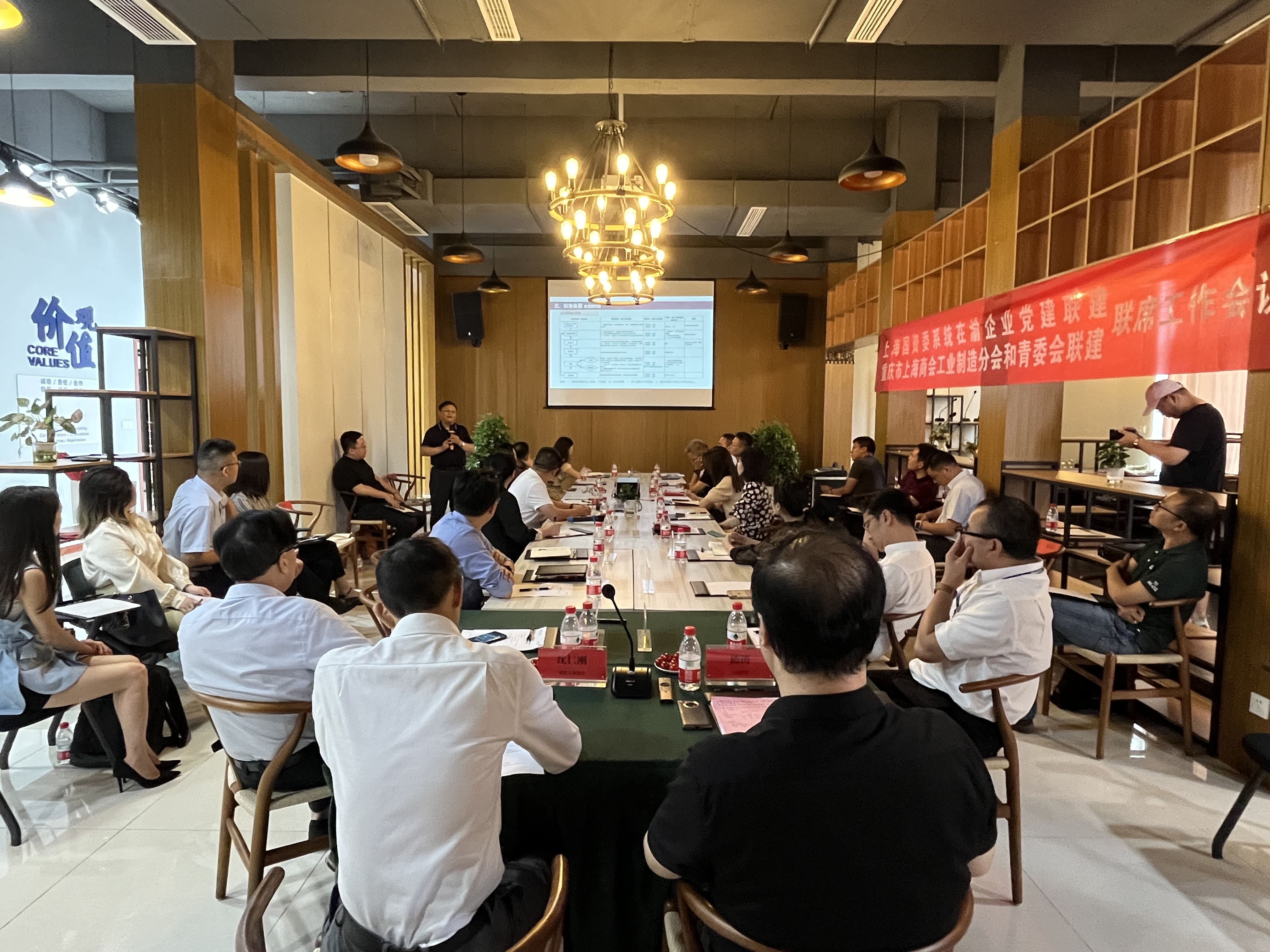2022年6月17日上午,重庆市上海商会工业制造分会和青年企业家委员会现场信息交流会在上汽通用五菱重庆分公司上汽工程师创新之家成功召开。商会执行会长沈仁刚,常务副会长、工业制造分会会长陈涛,秘书长姚庆伟,上汽通用五菱重庆分公司党委副书记汤政宪以及上海国资委系统在渝企业家共计30余人参加了会议。会议由商会常务副会长、工业制造分会会长陈涛主持。