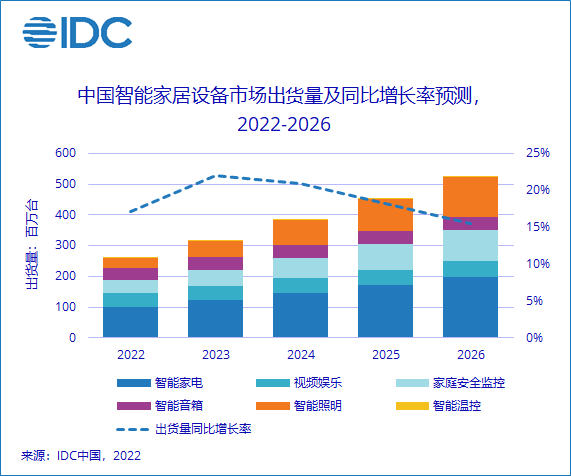 相比智能健身市场,中国智能家居的市场规模更加广阔。根据国际调研机构IDC发布的《中国智能家居设备市场季度跟踪报告(2021年第四季度)》,2021年中国智能家居设备市场出货量超过2.2亿台,IDC预计2022年该数字将突破2.6亿台,并在2026年突破5亿台大关。