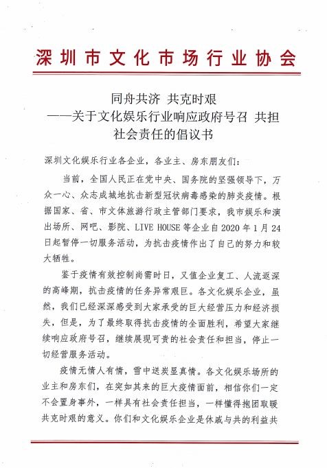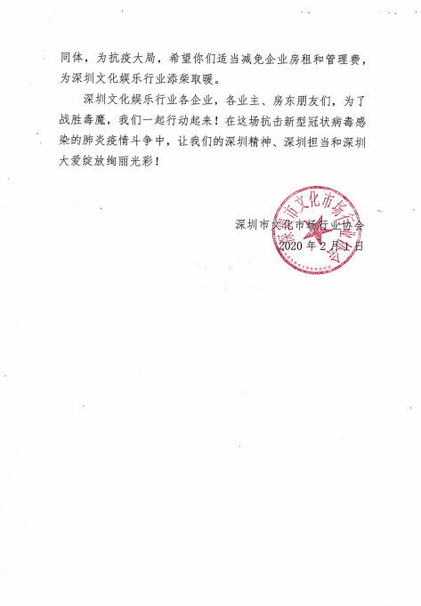 疫情无情人有情,雪中送炭显真情。各文化娱乐场所的业主和房东们,在突如其来的巨大疫情面前,相信你们一定不会置身事外,一样具有社会责任担当,一样懂得抱团取暖共克时艰的意义。你们和文化娱乐企业是休戚与共的利益共同体,为抗疫大局,希望你们适当减免企业房租和管理费,为深圳文化娱乐行业添柴取暖。