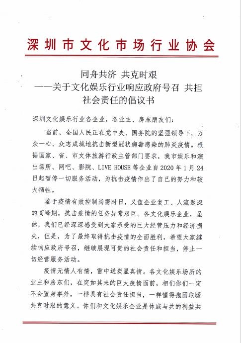 深圳文化娱乐行业各企业,各业主、房东朋友们,为了战胜毒魔,我们一起行动起来!在这场抗击新型冠状病毒感染的肺炎疫情斗争中,让我们的深圳精神、深圳担当和深圳大爱绽放绚丽光彩!