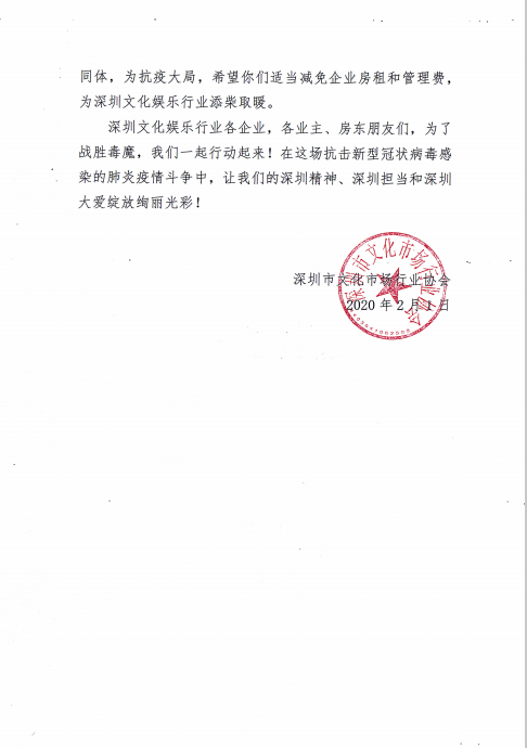 疫情无情人有情,雪中送炭显真情。各文化娱乐场所的业主和房东们,在突如其来的巨大疫情面前,相信你们一定不会置身事外,一样具有社会责任担当,一样懂得抱团取暖共克时艰的意义。你们和文化娱乐企业是休戚与共的利益共同体,为抗疫大局,希望你们适当减免企业房租和管理费,为深圳文化娱乐行业添柴取暖。