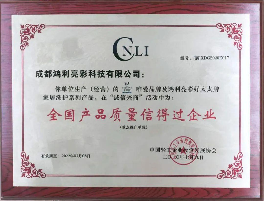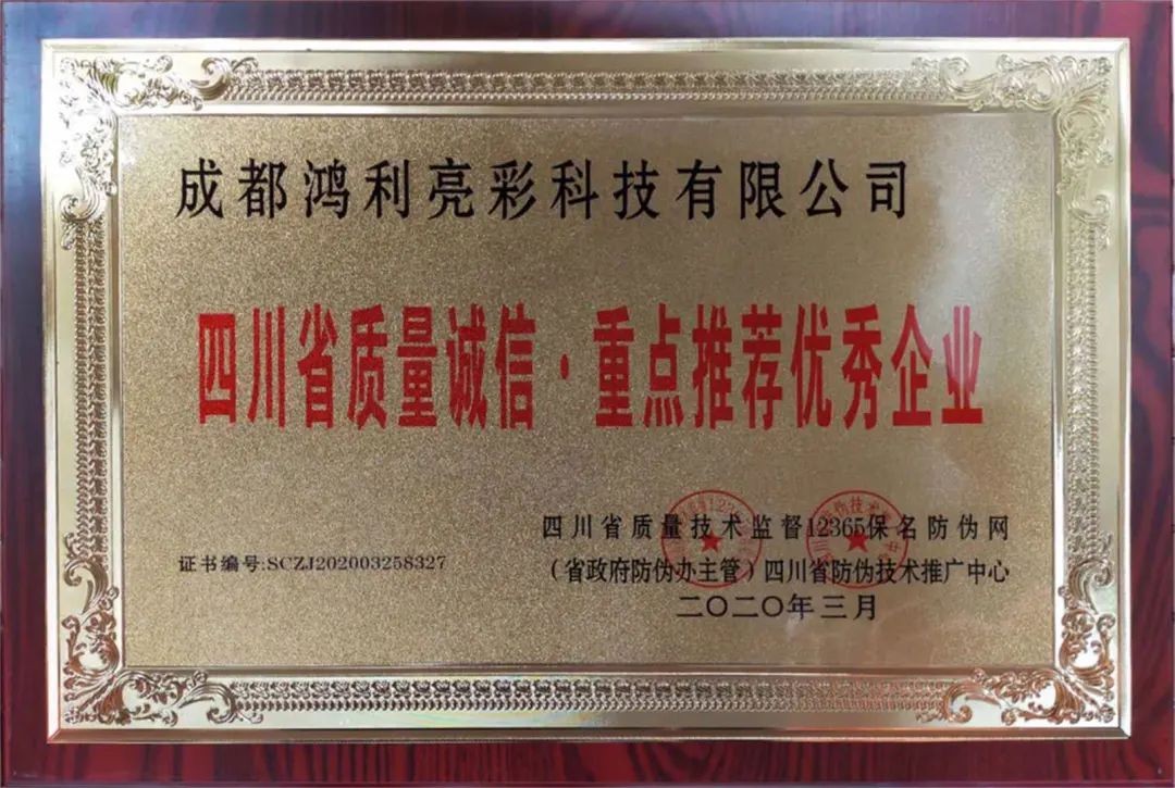 近日,我们四川省企业品牌创新促进会副会长单位——成都鸿利亮彩科技有限公司,在全国“诚信兴商”评选活动中被评为“全国产品质量信得过企业”。获得了中国轻工企业投资发展会颁予的这项荣誉称号。