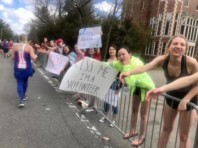记得在20公里的时候,刚跑完一个叫做“尖叫隧道”的地段,突然遇到一个山坡。山坡旁有一所护士学校,学生们举着加油的牌子,喊着“KISS ME ,KISS ME ”(亲吻我、亲吻我),她们亲吻路过的老人与年轻人们,一公里的路充满呐喊。