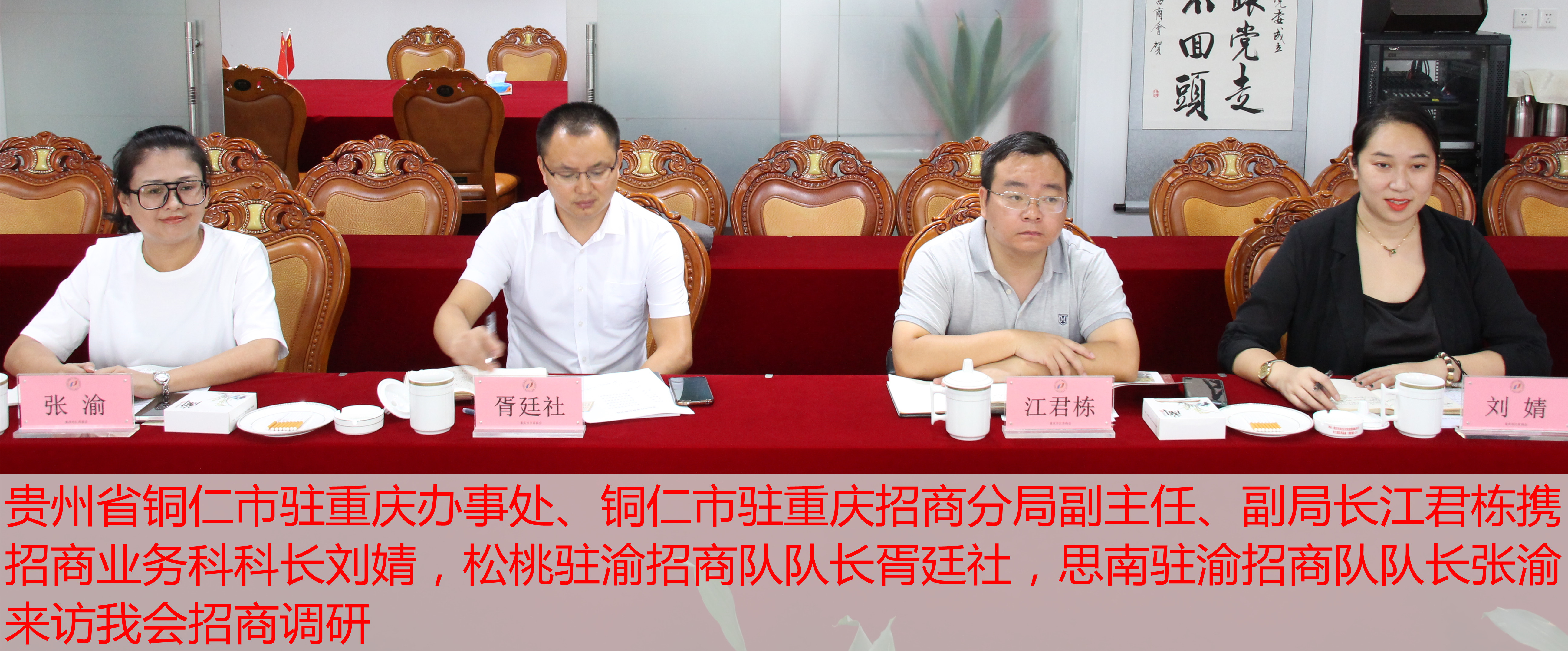 9月20日上午,贵州省铜仁市驻重庆办事处、铜仁市驻重庆招商分局副主任、副局长江君栋携招商业务科科长刘婧,松桃驻渝招商队队长胥廷社,思南驻渝招商队队长张渝来访我会招商调研。我会秘书长沈圣林携秘书处秘书热情欢迎领导们莅临我会考察指导工作。