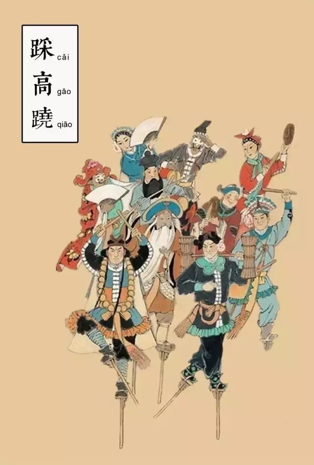 高跷本属中国古代百戏之一种,早在春秋时已经出现。踩高跷的人往往装扮戏曲折子,身着戏装,浓妆艳抹,且歌且舞。而踩高跷的角色,