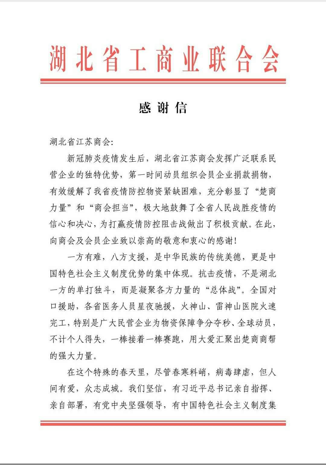 6月10日,我会收到湖北省工商业联合会发来的感谢信,并被授予湖北抗击新冠肺炎疫情突出贡献单位。