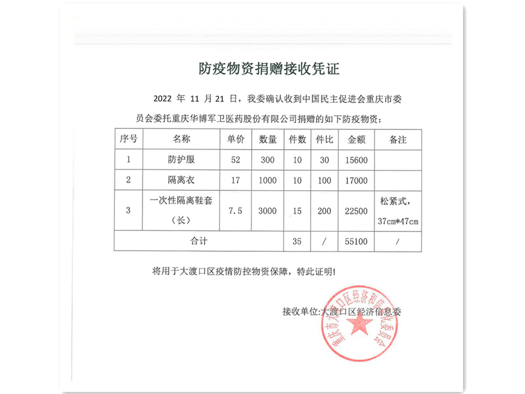 我会常务副会长单位重庆华博军卫医药股份有限公司受中国民主促进会重庆市委员会委托,向大渡口区经信委捐赠防护服、隔离衣等防疫物资,捐赠金额共计55100元。