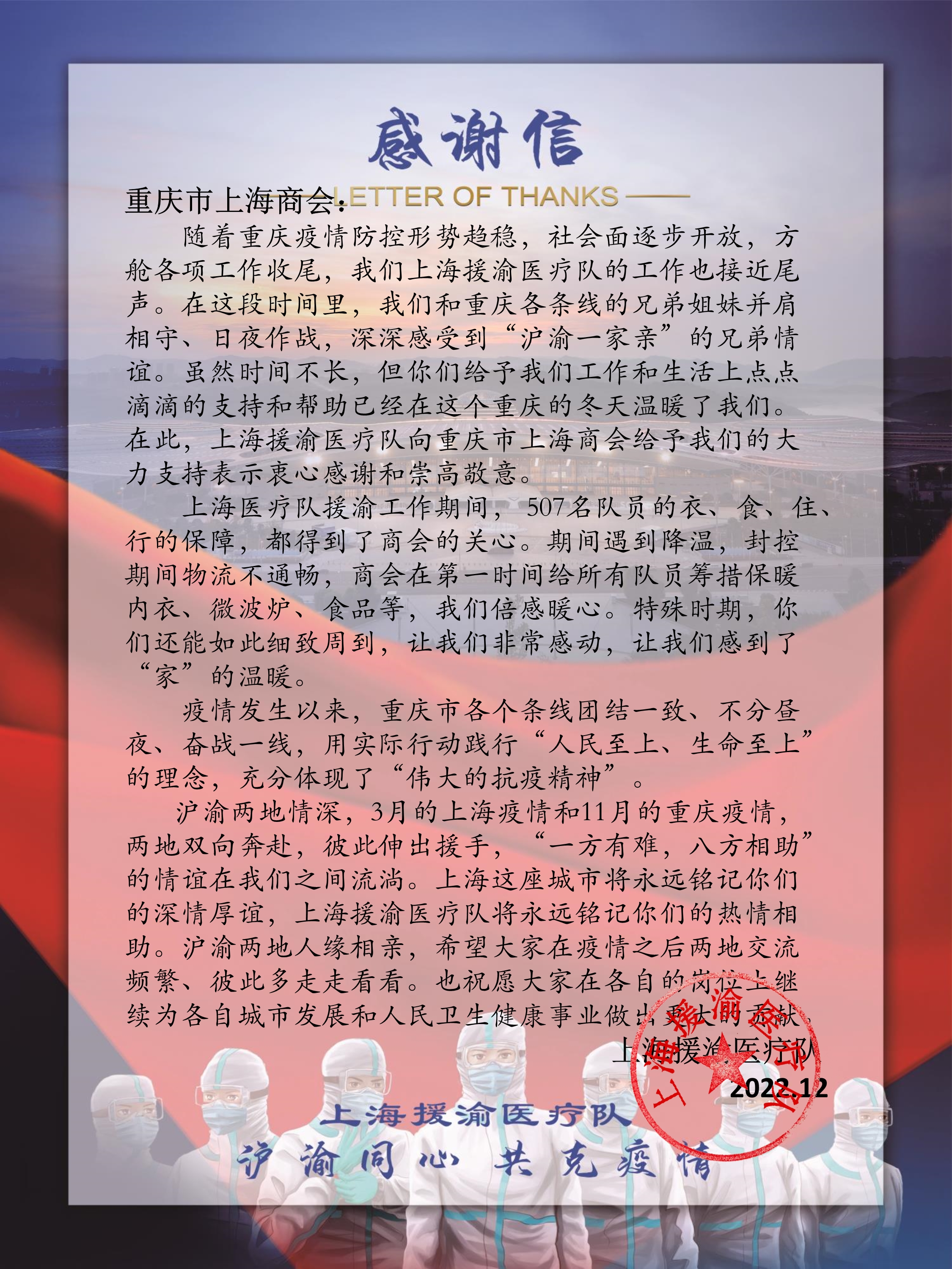 2022年12月12日,重庆市上海商会收到了一封来自上海援渝医疗队的感谢信,向商会捐赠给上海援渝医疗队的急需物资表示衷心感谢和崇高敬意!