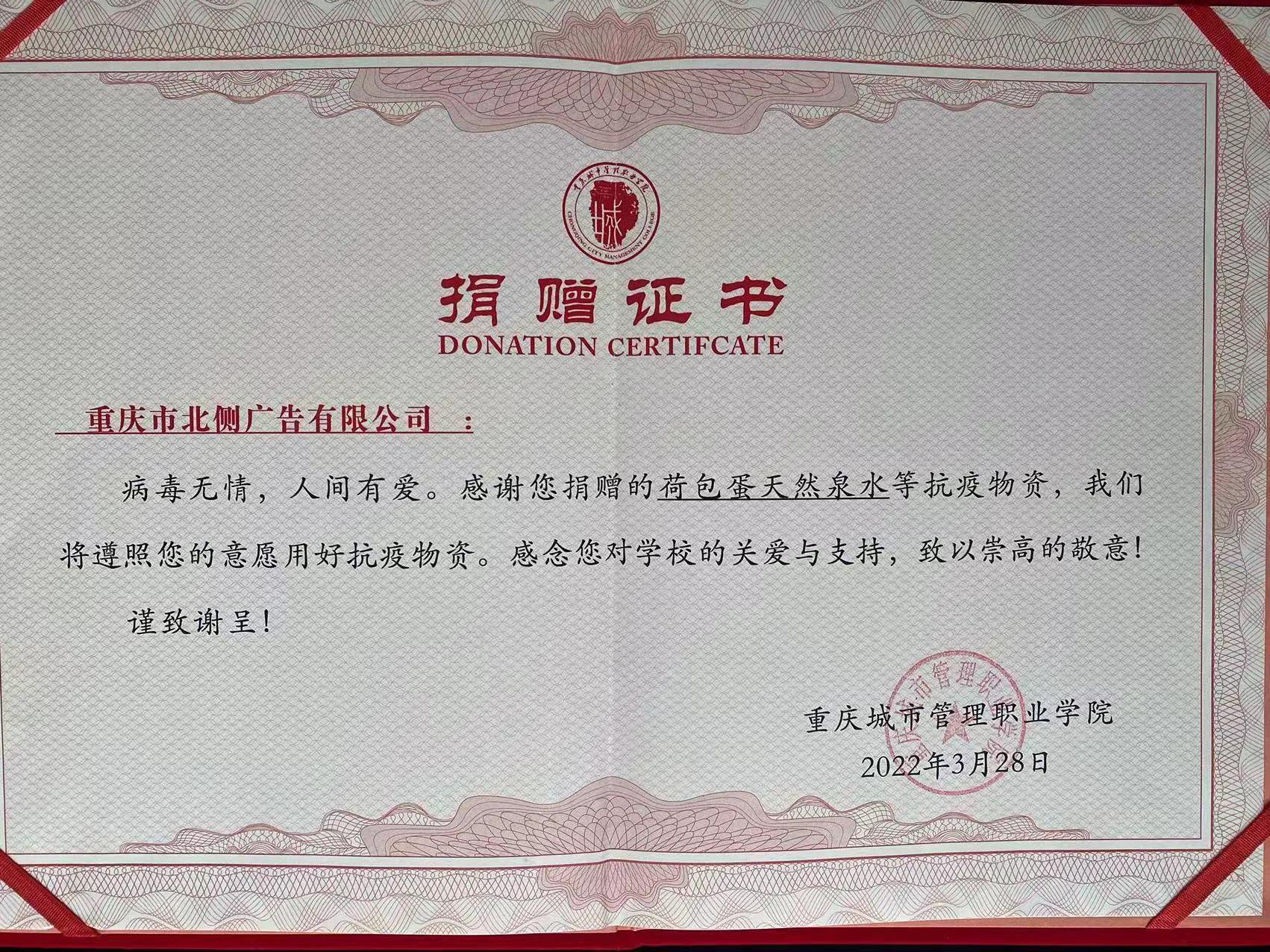 会员单位重庆北侧广告有限公司向重庆城市管理职业学院捐赠10万元抗疫物资。▼