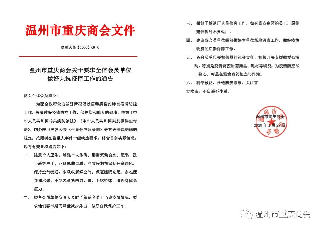 1月27日晚,按照浙江省重大事件一级响应要求,发布【温州市重庆商会关于要求全体会员单位做好共抗疫情工作的通告】希望各会员单位要积极履行社会责任,积极开展支援献爱心活动,特别是疫情防控所需药品、耗材等物资,为疫情防控尽一份心,彰显在温渝商的担当与作为。