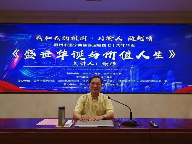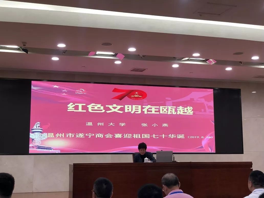 上午,原温州大学张小燕教授和温州市委原副秘书长谢浩教授,分别给温州市重庆商会、温州遂宁商会、温州市万州商会、乐清市重庆商会、邻水县总商会温州分会、温州市宜宾商会(筹)的会员做了《红色文明在瓯越》和《盛世华诞与价值人生》的专题讲座。
