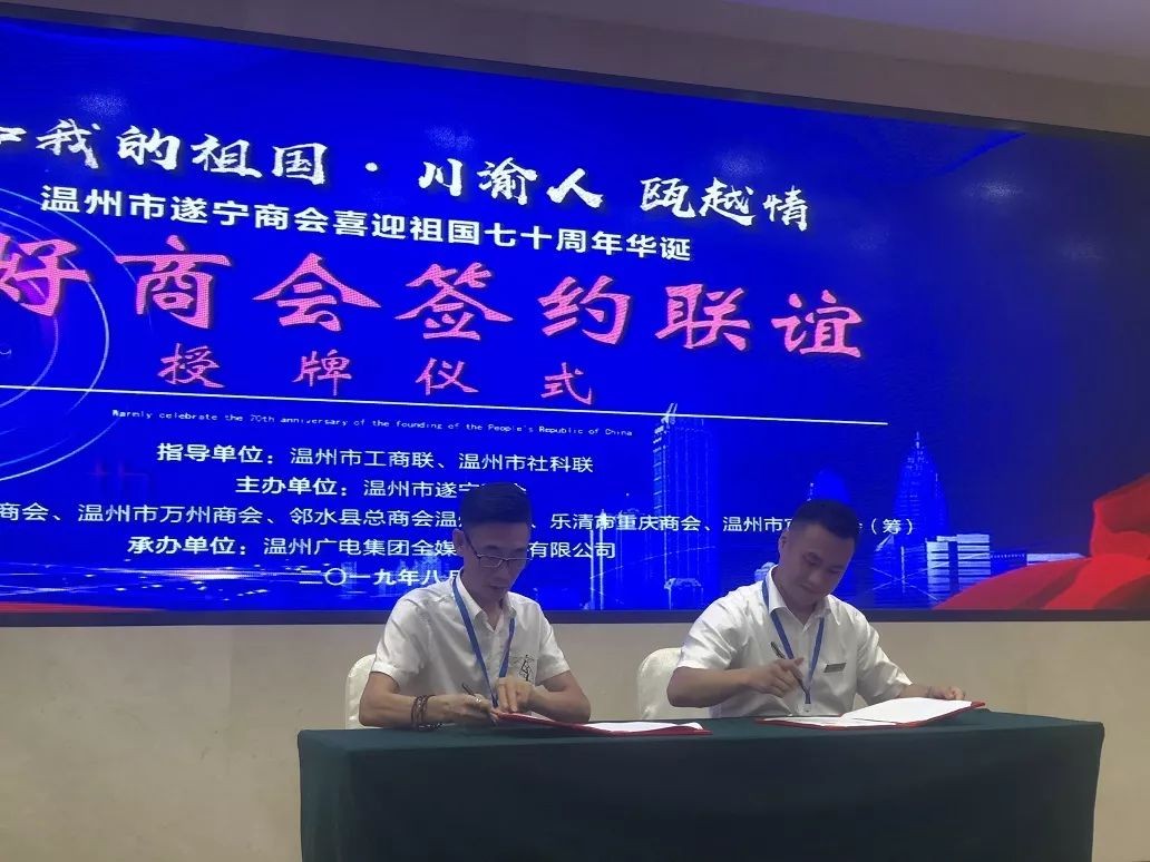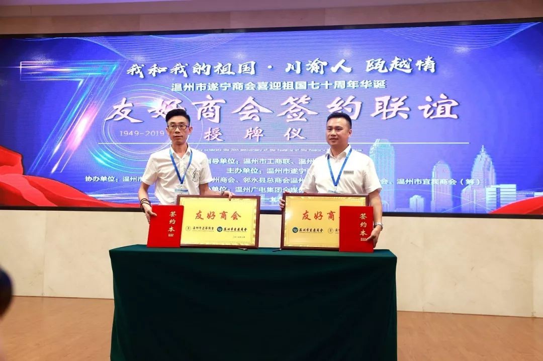 大会上,我会执行会长兼秘书长王政代表温州市重庆商会与温州市遂宁商会会长严庆东签约“友好商会”协议并授牌合影留念。