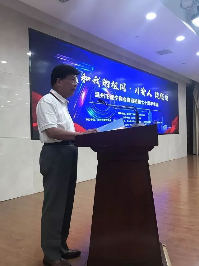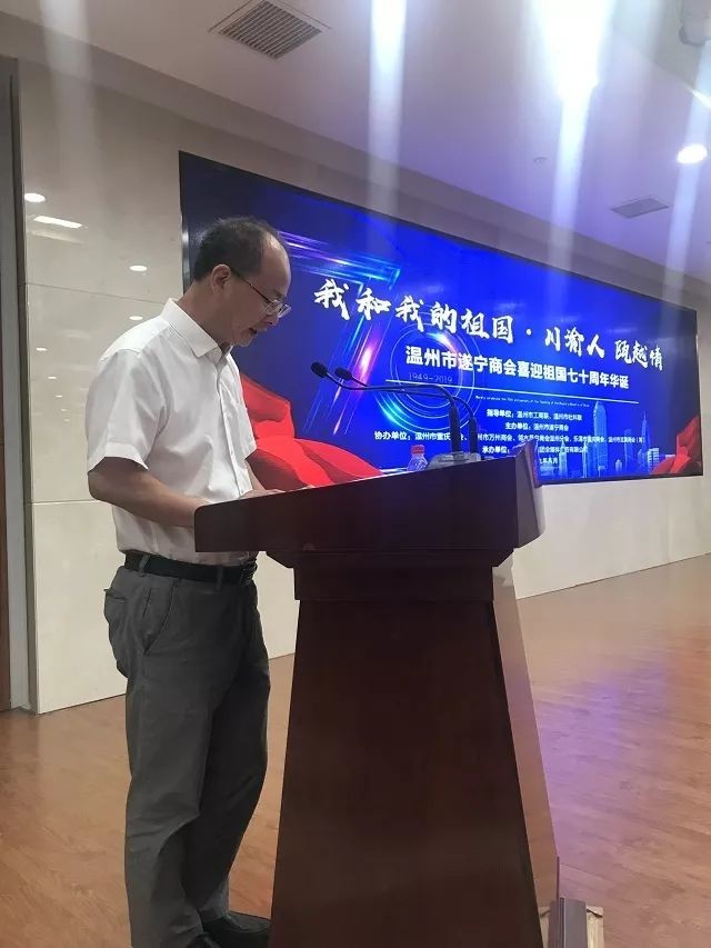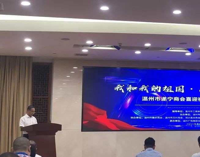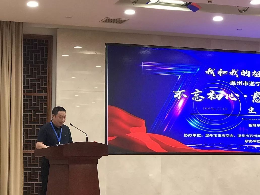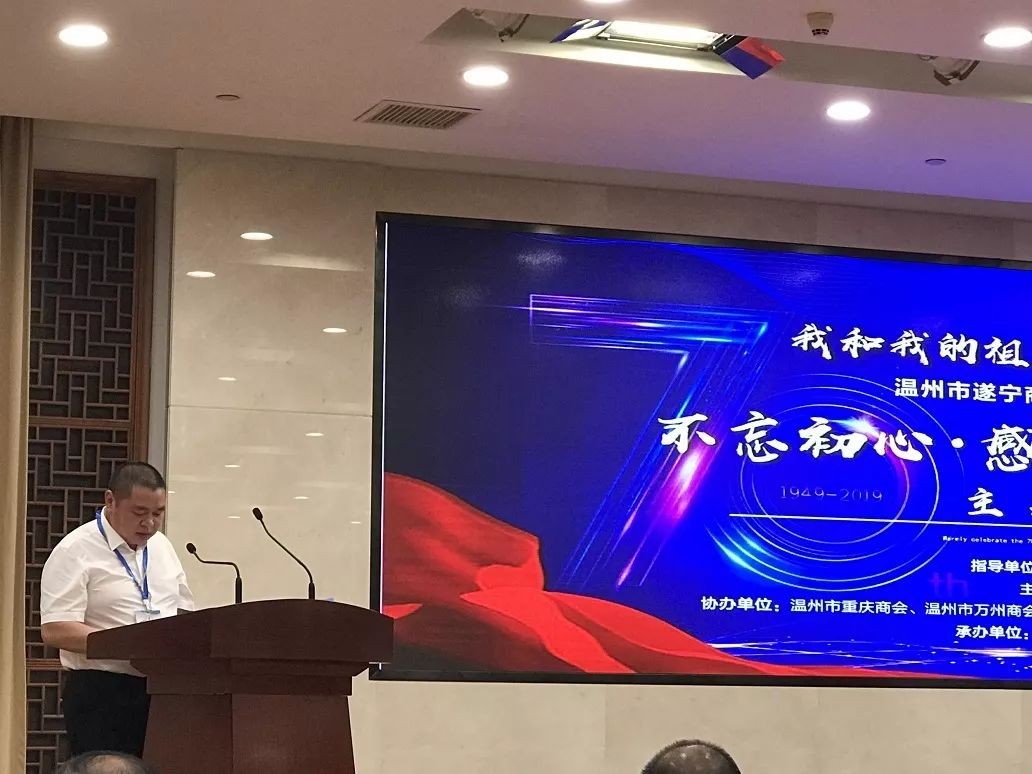 8月18日,“我和我的祖国·川渝人 瓯越情”喜迎祖国七十周年华诞活动在温州市人民大会堂隆重举办,活动由温州市遂宁商会主办,温州市重庆商会、乐清市重庆商会、温州市万州商会、邻水县总商会温州分会、温州市宜宾商会(筹)等协办。温州市工商联副主席徐欣隆,遂宁市工商联副主席敬华全,遂宁市市人大常委会原副主任、人民政府原副市长、市关工委常务副主任刘思俊等领导,嘉宾,会员代表共计200余人出席活动,我会会长安良均,执行会长兼秘书长王政,执行会长余海龙、张成明、严庆东,常务副会长邓永明、冉小权,副会长周蓉,党支部书记张莉珍,副秘书长李海波、张美洁,理事陈清明、程良勤及会员代表近40余人受邀参会。