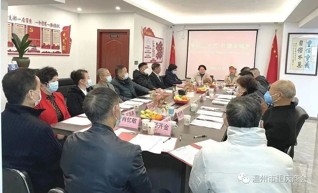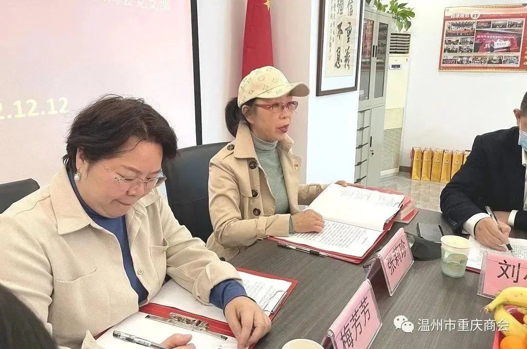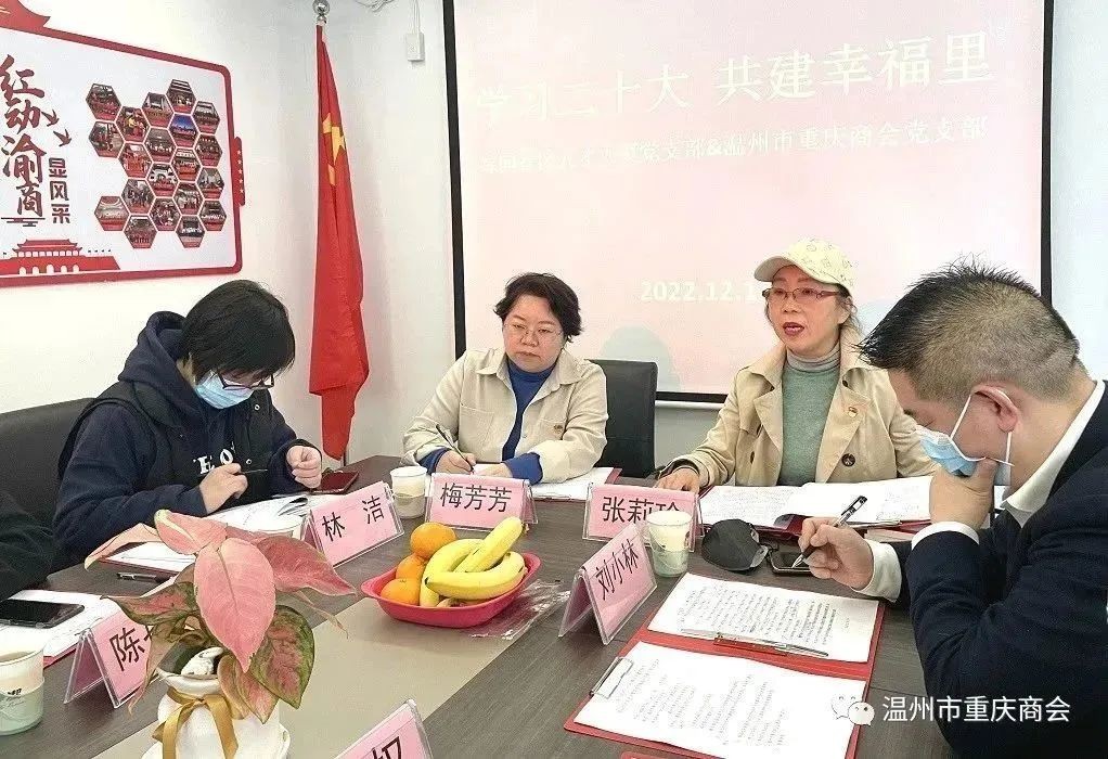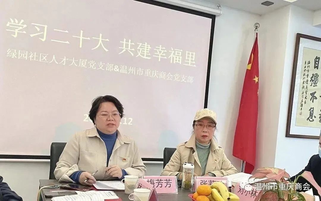 为切实发挥基层社会组织在社区建设、管理、服务工作中的积极作用,12月12日下午,温州市重庆商会党支部携手绿园社区人才大厦党支部,在商会会议室联合开展了“学习党的二十大·携手共建幸福里”党建共联共建活动。