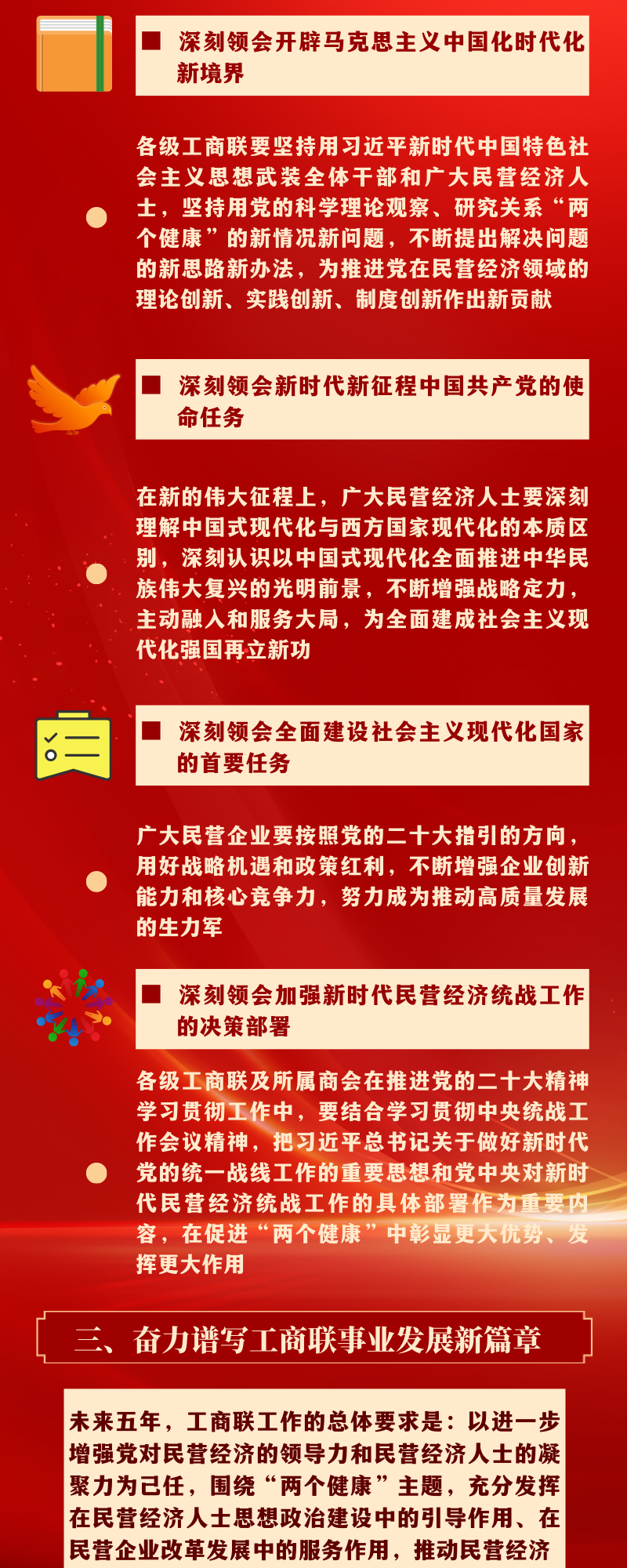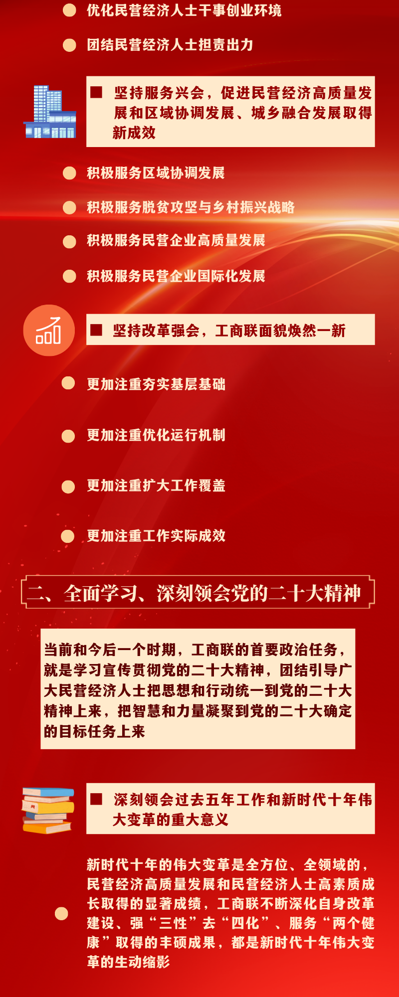 导读:中国工商业联合会第十三次全国代表大会12月11日在北京开幕。全国政协副主席、全国工商联主席高云龙代表全国工商联第十二届执行委员会作工作报告。报告在全面回顾工商联五年来的工作后指出,工商联要全面贯彻习近平新时代中国特色社会主义思想,深入学习贯彻党的二十大精神,认真落实中央统战工作会议精神,围绕促进“两个健康”主题,充分发挥在民营经济人士思想政治建设中的引导作用、在民营企业改革发展中的服务作用,推动民营经济高质量发展,积极引导广大民营经济人士争当爱国敬业、守法经营、创业创新、回报社会的典范,做合格的中国特色社会主义事业建设者,为全面建设社会主义现代化国家、实现中华民族伟大复兴作出新的更大贡献。