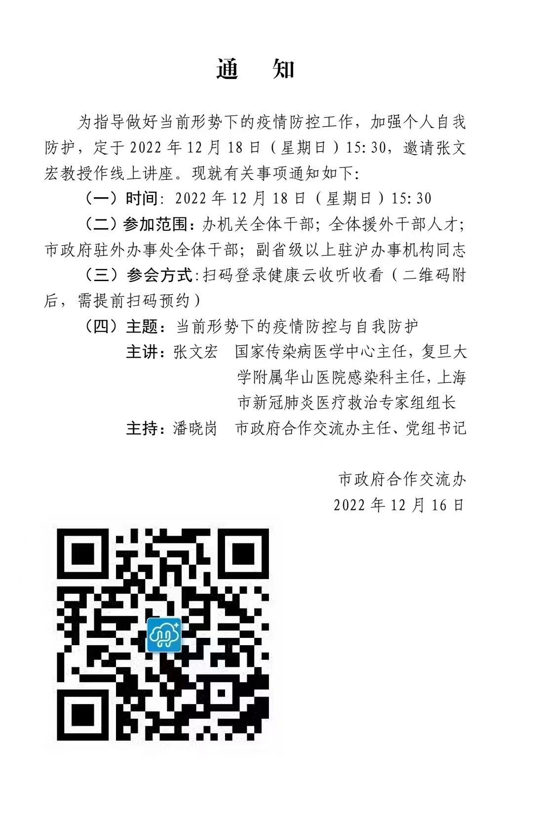 编者按:上海市政府合作交流办特邀国家传染病医学中心主任,复旦大学附属华山医院感染科主任,上海市新冠肺炎医疗救治专家组组长张文宏作主题为“当前形势下的疫情防控与自我防护”线上直播。请各位会员企业积极收看。